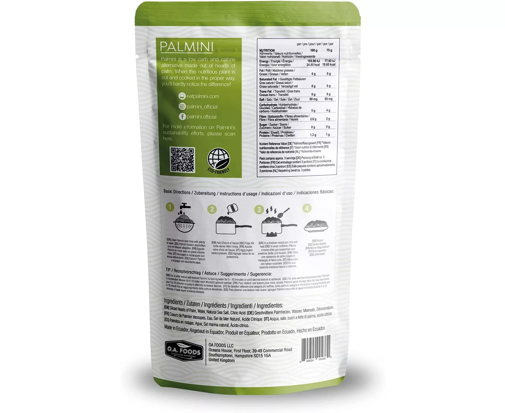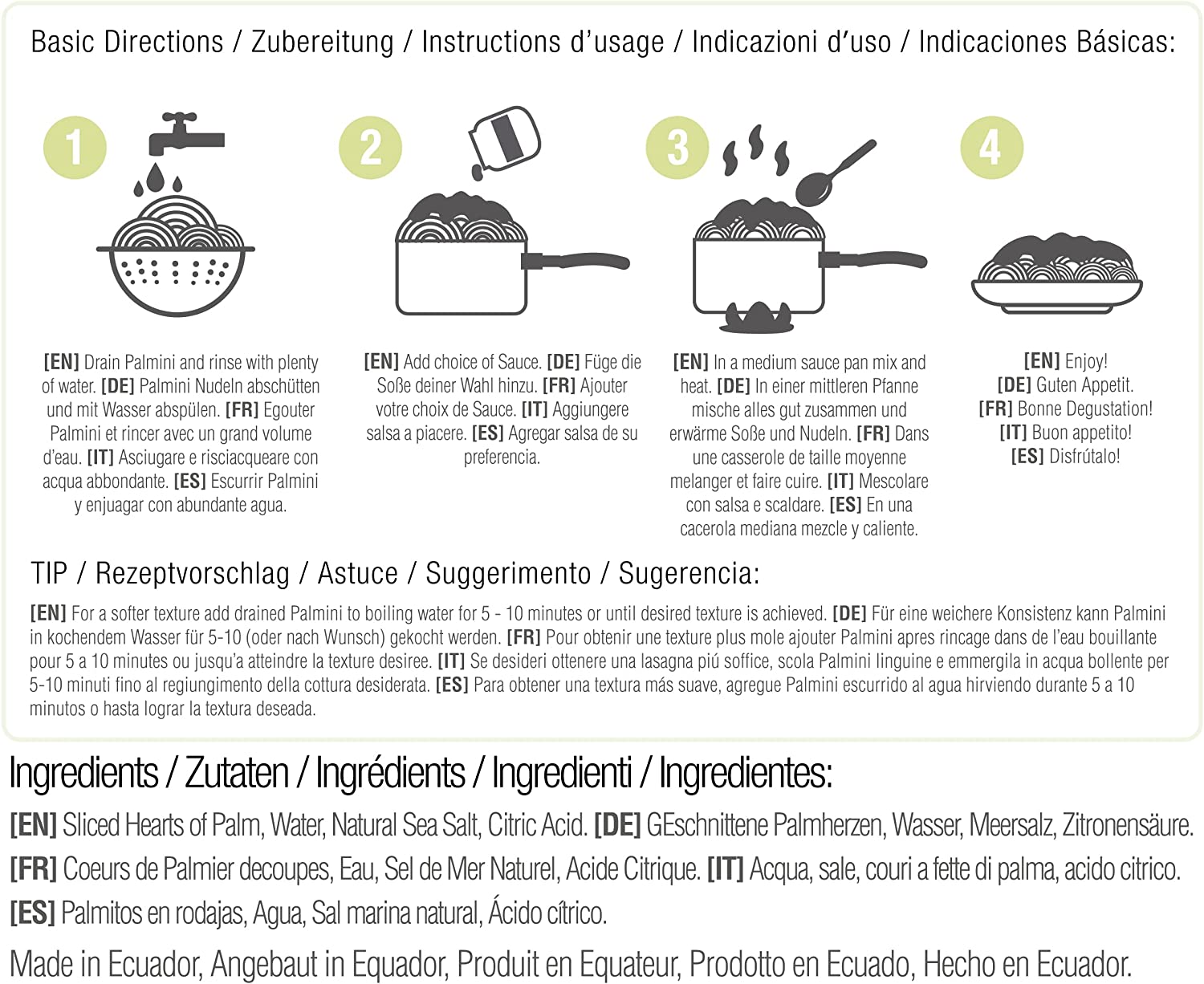 Palmini is a low carb pasta substitute, made completely out of a natural plant known as Hearts of Palm. When this plant is cut and cooked in the proper way, its resemblance to regular pasta is remarkable. Not only does it look like pasta, but it can also taste like pasta!. Palmini is low in calories, Palmini is high in fiber and 90% water. This combination creates an “almost” calorie free product!. Palmini is already cooked and perfectly al dente! Just drain and rinse the product thoroughly, then add your favorite sauce! . Pre-cooked gluten free pasta substitute. Non GMO. Great taste. Sugar free