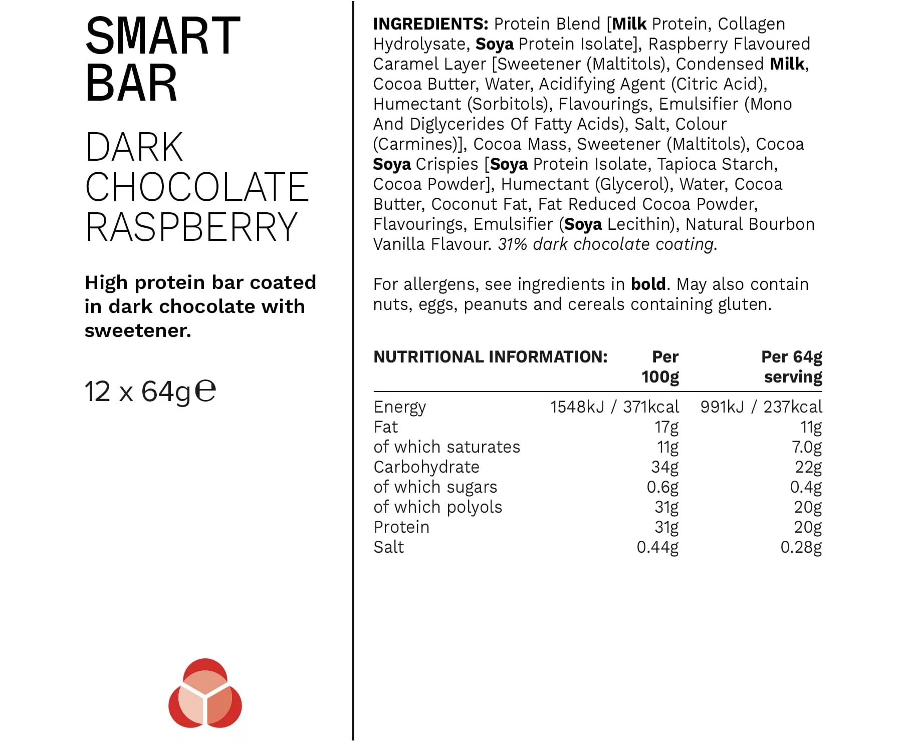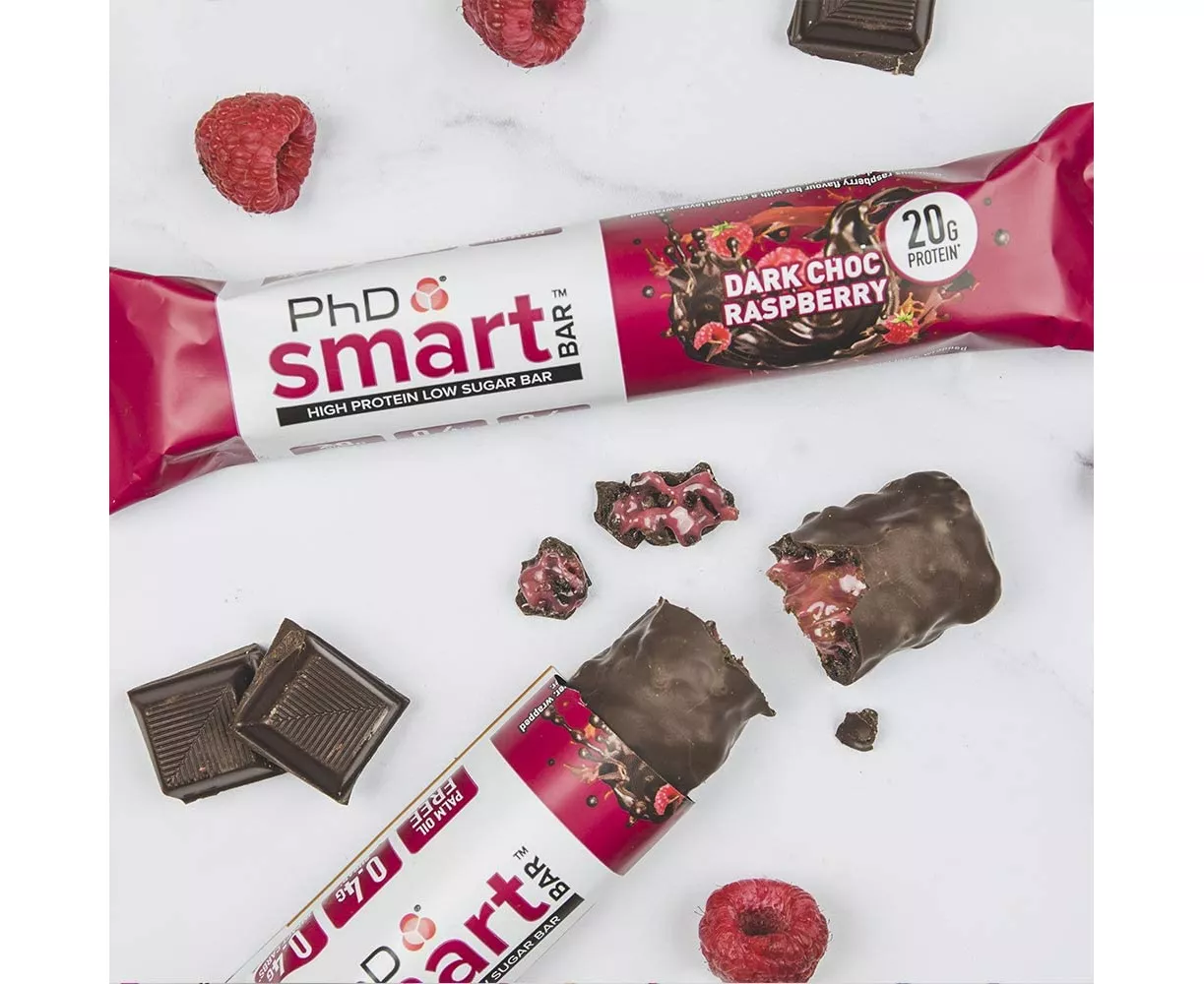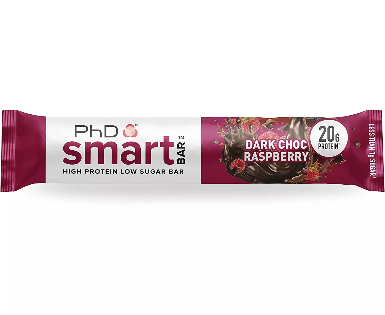 PhD Smart Bar-High Protein Low Sugar Bar, Dark Choc Raspberry, 64 g, Pack of 12, Great tasting, triple layered bar, Contains no palm oil or FOS, Available in 8 delicious flavours
