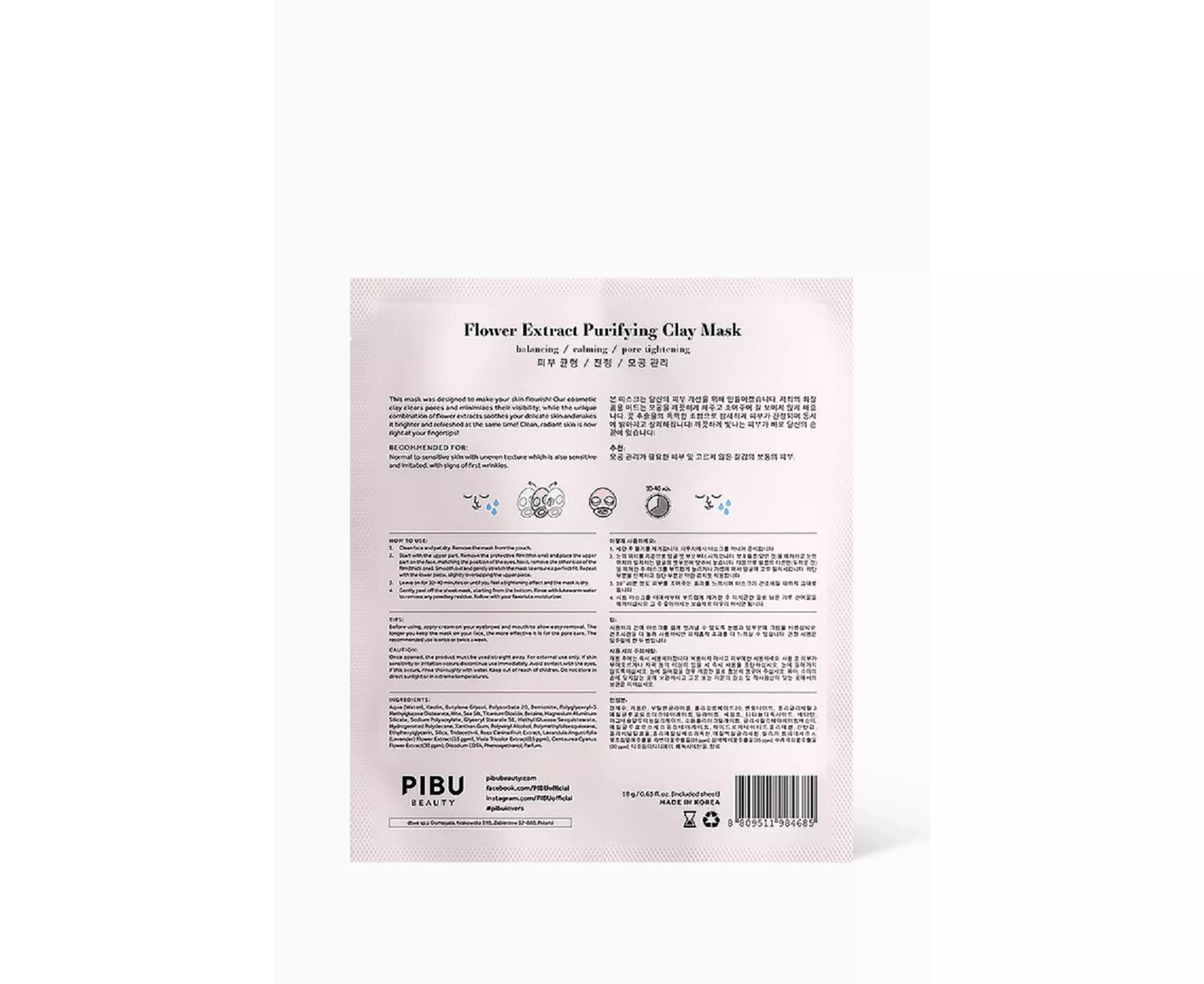 Pibu Flower Extract Purifying Clay Sheet Mask clears out pores and leaves skin looking brighter and feeling refreshed. The cleansing clay contained in it deeply cleanses, absorbs excess sebum and narrows pores, while flower extracts regenerate and strengthen delicate skin. Recommended for normal and sensitive skin, skin with imperfections, irritated skin or skin displaying first signs of aging.