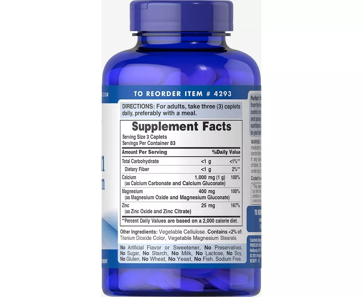 Puritan's Pride offers a high quality Calcium / Magnesium / Zinc supplement that delivers 1000 mg Calcium, 400 mg Magnesium and 25 mg Zinc in one convenient form for optimal nutritional support. Calcium is the primary mineral responsible for strong bones.* The body cannot produce calcium, so proper amounts must be ingested in order to provide the body with this essential nutrient.
