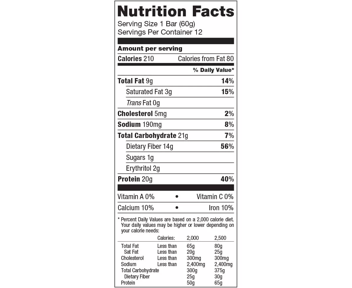 • 20g protein, 4g net carbs, 1g sugar, 14g fiber per bar