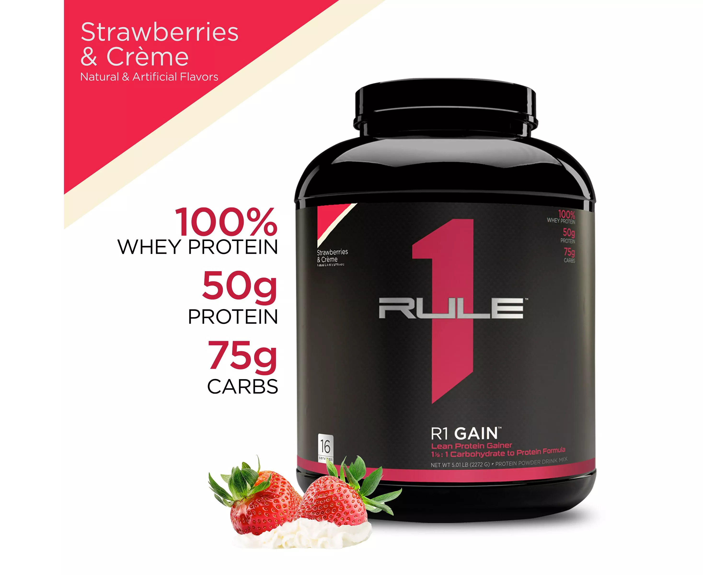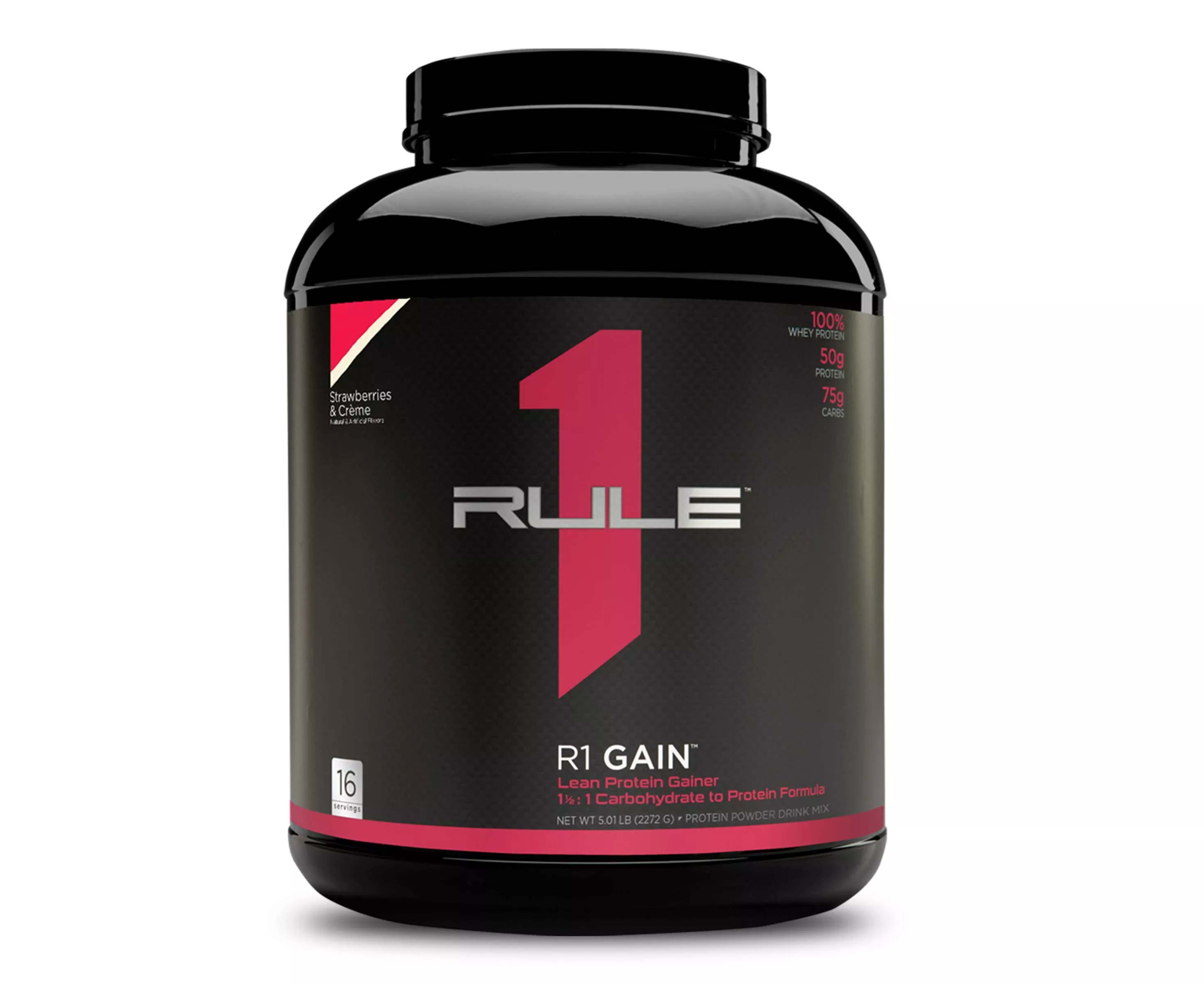 R1 Gain Lean Protein Gainer 1-1/2: 1 carbohydrate to protein formula 100% whey protein 50g protein 75g carbs.