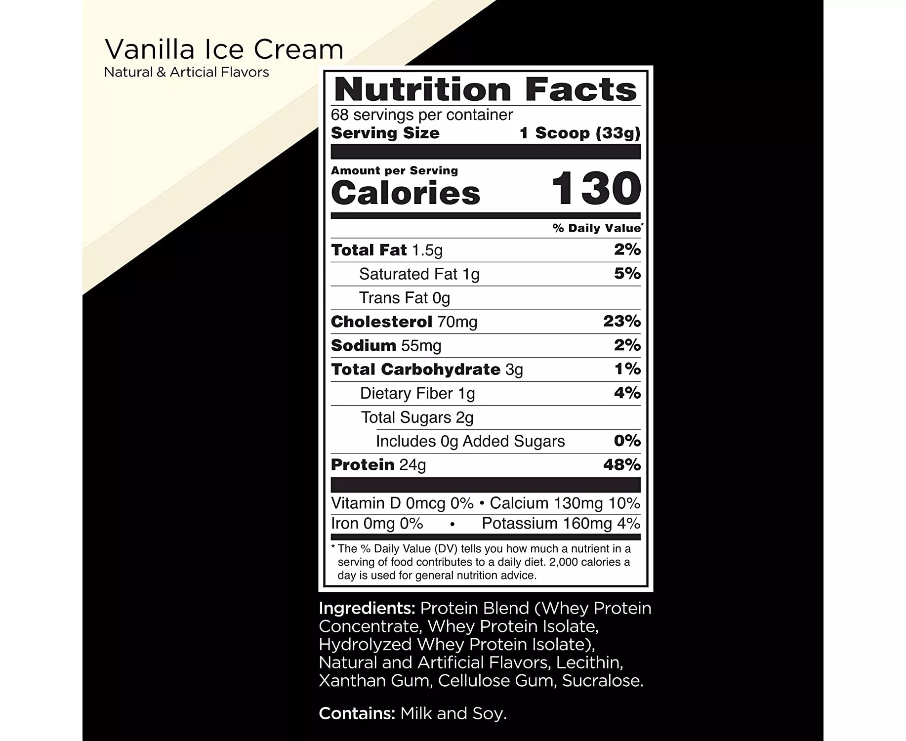 Protein Blend (Whey Protein Concentrate, Whey Protein Isolate, Hydrolyzed Whey Protein Isolate), Natural and Artificial Flavors, Lecithin, Xanthan Gum, Cellulose Gum, Sucralose. Allergen info: contains milk and soy.