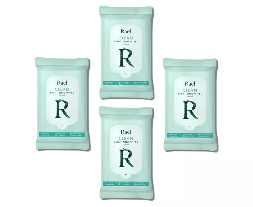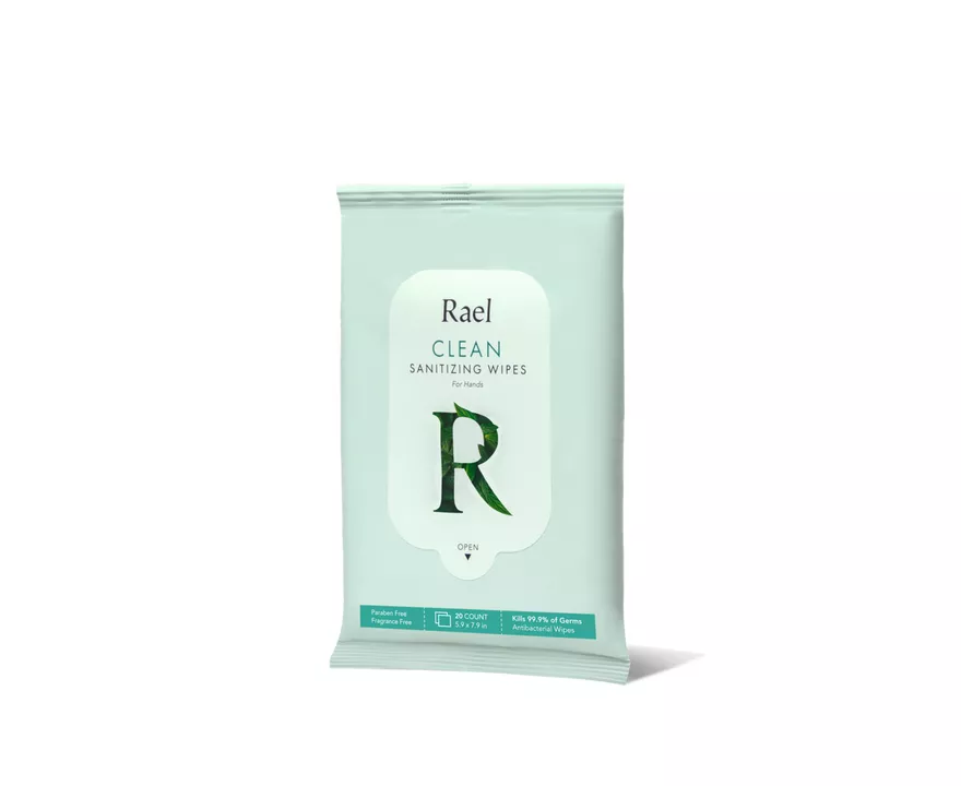 Rael Clean Sanitizing Wipes for Hands. Keep your hands clean and soft even when there's no soap or water within reach. As viruses clock overtime hours this season, Rael's Sanitizing Hand Wipes help stop the spread of 99.9% of harmful germs without the dry or sticky feeling that typically comes with gel sanitizers. Conveniently travel-sized so you can stash in your purse, desk, or car.. Kills 99.9% of harmful germs with Benzalkonium Chloride. Vegan & cruelty-free. Free of Parabens and Artificial Fragrance. 20 count. Thoroughly wipe the surface of your hands to remove dirt and viruses so you can protect the health of your nearest and dearest. RUHL-WU23. RAEL-SNWP-V10-01. From tackling the taboo to beyond-functional products, Rael is on a mission to make periods better by providing holistic feminine care that actually works. Innovative, natural, and effective solutions support you during all phases of your cycle, including their organic cotton period care, everyday feminine hygiene essentials, and skincare products specially formulated for hormonal changes throughout the month