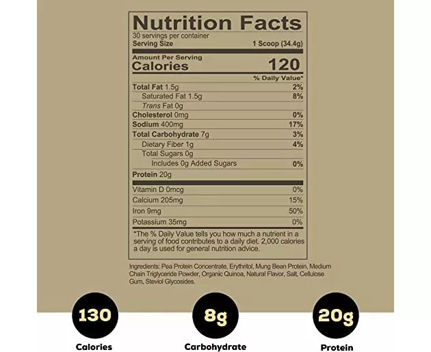 Pea Protein Isolate, Brown Rice Protein, Quinoa Protein, Coconut Water Powder, Erythritol, Dark Roast Peanut Powder, Natural Flavors, Cellulose gum, Stevia Extract, Salt.