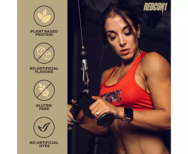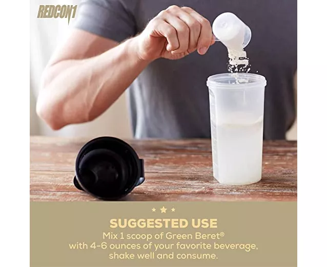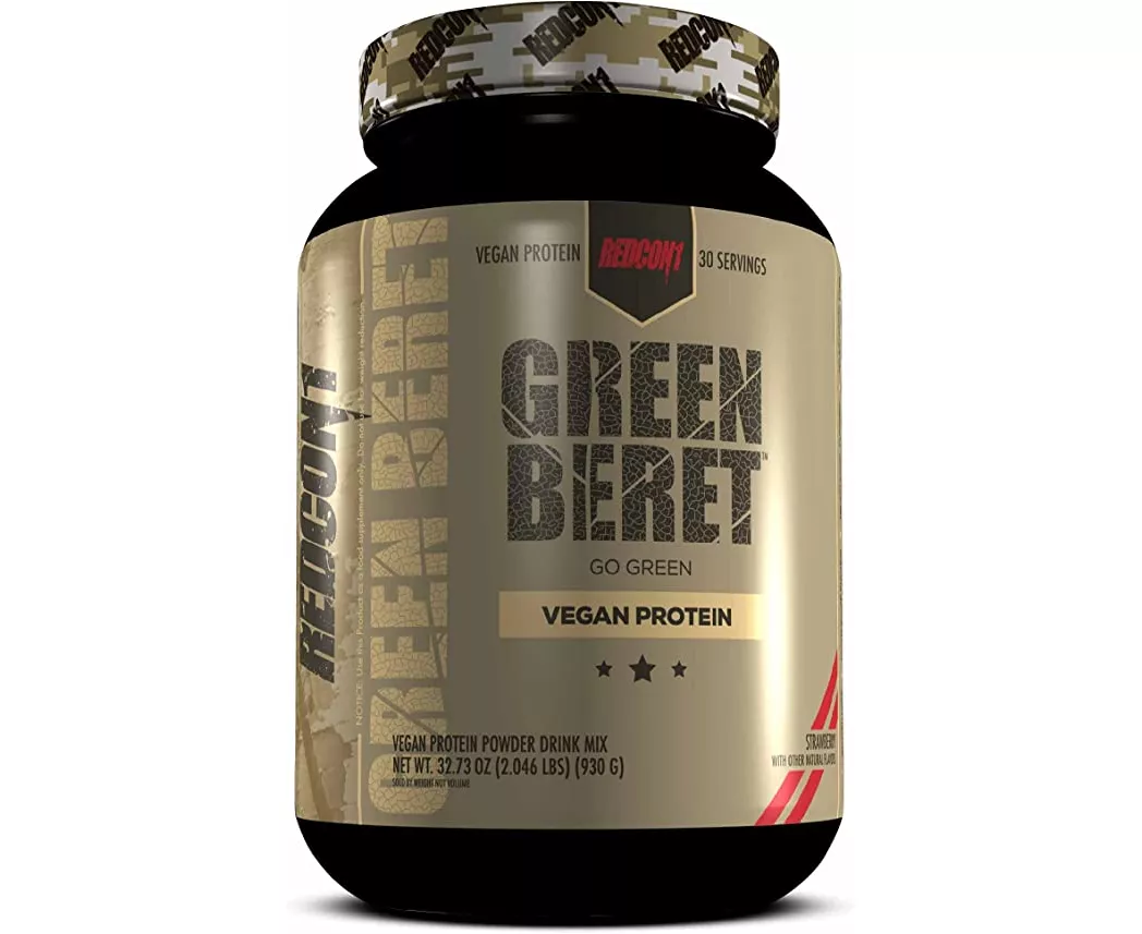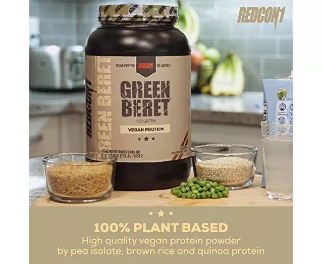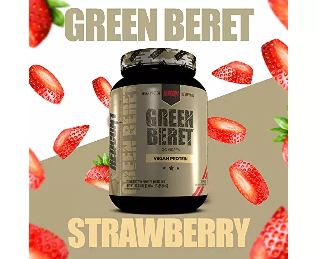 RedCon1 Green Beret Vegan Protein - Strawberry: A Plant-Based Protein Post workout or throughout the day, you won't find a better vegan protein than Green Beret. Build and repair muscle with a smooth delicious, and easy to digest vegan protein. Vegan protein mix Provides 20g protein per serving Getting adequate amounts of protein is crucial to supporting your muscles and keeping your body in a positive nitrogen balance Emerging research shows that consuming adequate amounts of dietary protein induces satiety and reduces the feeling of hunger when compared to carbohydrates or fats Gluten free No artificial flavor or dyes