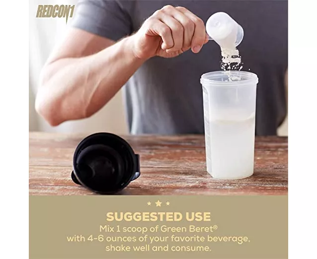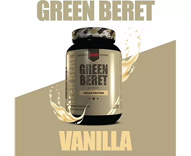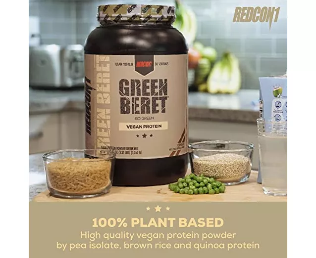 RedCon1 Green Beret Vegan Protein - Vanilla: A Plant-Based Protein Post workout or throughout the day, you won't find a better vegan protein than Green Beret. Build and repair muscle with a smooth delicious, and easy to digest vegan protein. Vegan protein mix Provides 20g protein per serving Getting adequate amounts of protein is crucial to supporting your muscles and keeping your body in a positive nitrogen balance Emerging research shows that consuming adequate amounts of dietary protein induces satiety and reduces the feeling of hunger when compared to carbohydrates or fats Gluten free No artificial flavor or dyes