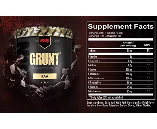 For the athlete or bodybuilder who takes recovery seriously. Grunt is a potent and effective EAA formula packing 9 amino acids necessary for growing new and preserving existing muscle mass. Do not confuse EAA's with BCAA. Although both are needed by the body and only provided via nutrition or supplementation, EAA's are a complete protein source, whereas BCAA are not. Research indicates that EAA's are best used as part of your pre-workout routine, while BCAA's are most beneficial post workout due to their higher doses. Use the supplement elite athletes have known about for years. If you want to unlock new growth and keep your muscles well-hydrated and properly fed with a steady dose of amino acids, make sure you keep Grunt as part of your daily, year-round supplement program. Reduces muscle soreness Hydrates muscle cells Most Beneficial Pre-Workout Complete Protein Source Improves Recovery.