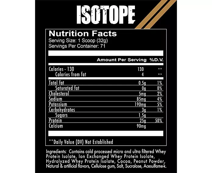 ISOTOPE is made from 100% Whey protein Isolate. It is free from lactose and contains 25g of protein, 3g of carbohydrates, 0.5g of total fat and 130 calories per serving (one scoop). It’s 100% reliable for the hardcore bodybuilder or athlete who needs precision and accuracy when calculating your daily caloric needs.