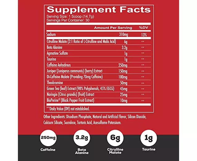Citrune Malate, Beta-Alanine, Agmatine Sulfate, Taurine, Caffein Anhydrous, Ampiblast, Di-Caffeinate Malate, Cocophenals, Naringin, BioPerine