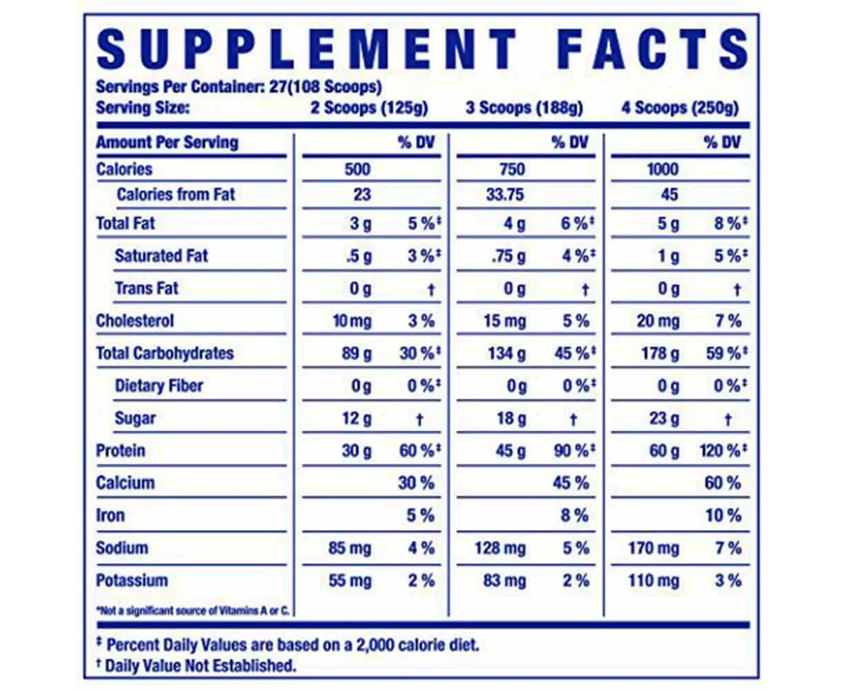 • 180G CARBOHYDRATES: Each full serving has 180g carbs and 1,000+ calories. Each bulk bag of the mass weight gainer has 108 loaded scoops to last you a long time. Ronnie Coleman Mass Gainer for men and women also includes Creatine & Glutamine in each serving.