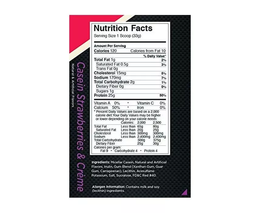 Micellar Casein, Natural and Artificial Flavors, Sunflower Lecithin, Cellulose Gum, Xanthan Gum, Sucralose, Acesulfame Potassium, FD&C Red #40