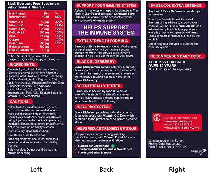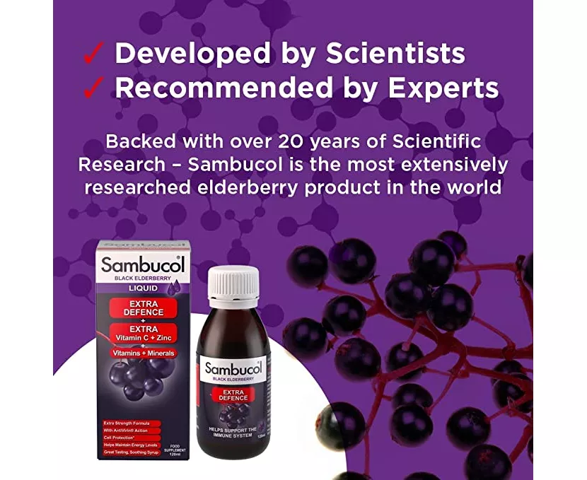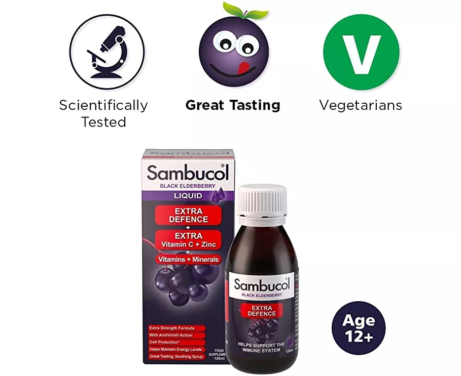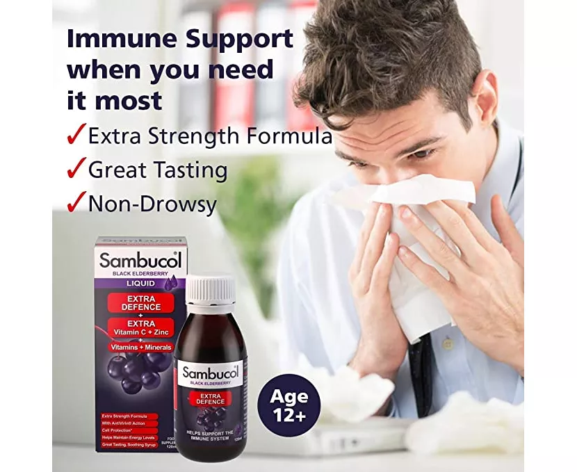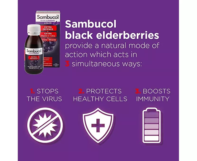 Extra strength immune support - sambucol extra defense contains black elderberries as well as vitamin c, b6, and d, zinc, folic acid, and minerals to help strengthen the immune system and reduces tiredness and fatigue.