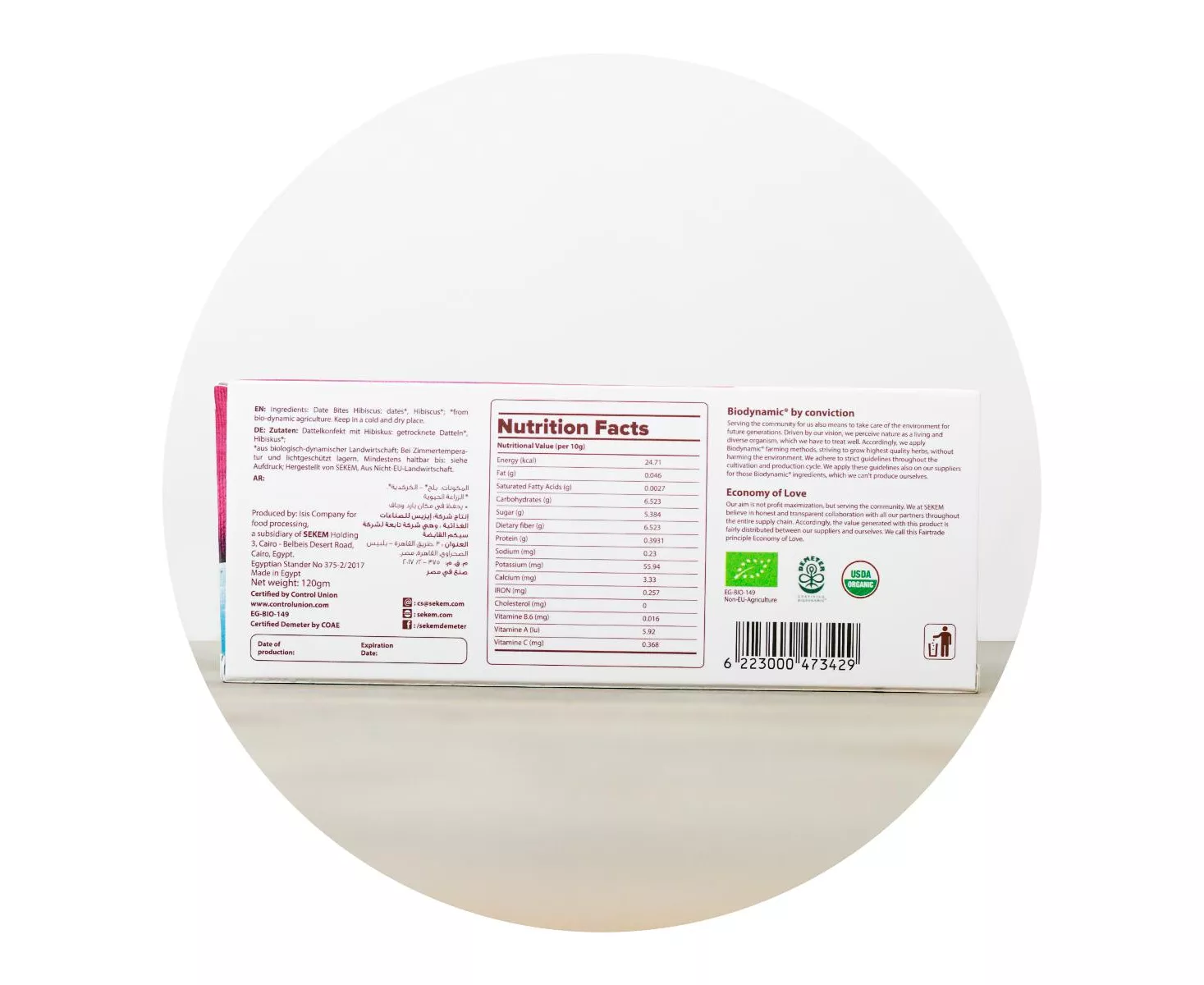 Date paste (85%), hibiscus powder (15%)Ingredients from 100% organic dynamic cultivatio