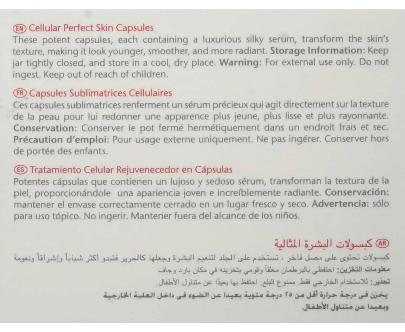 These potent capsules, each containing a luxurious silky serum, instantly transform the skin’s texture, making it look younger, smoother, and more radiant. The strong antioxidant blend protects the skin from free-radical damage, while stimulating and regenerating the skin. The ‘perfect skin’ serum is suitable for all skin types and is formulated with powerful active ingredients including a Polyphenol Complex, comprised of Grape Seed Extract and Phospholipids to improve skin elasticity and fight free radicals. Additionally, the Cellular Perfect Skin Capsules are enriched with plant extracts, which activate cell metabolism and improve blood circulation; and moisturizing agents which help restore the skin’s hydrolipidic film and regulate moisture balance.