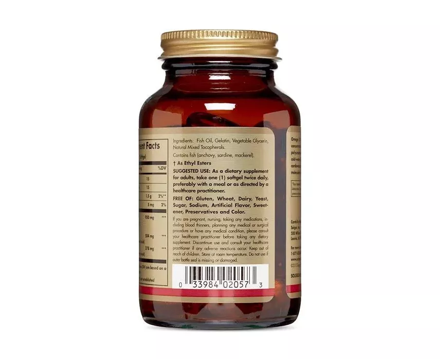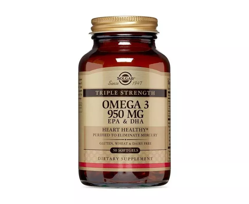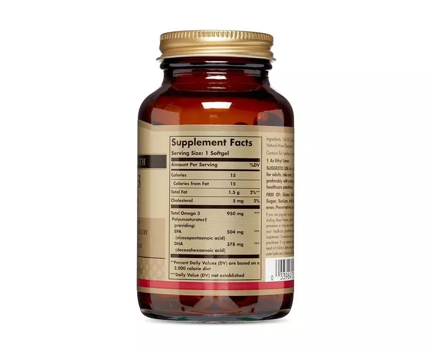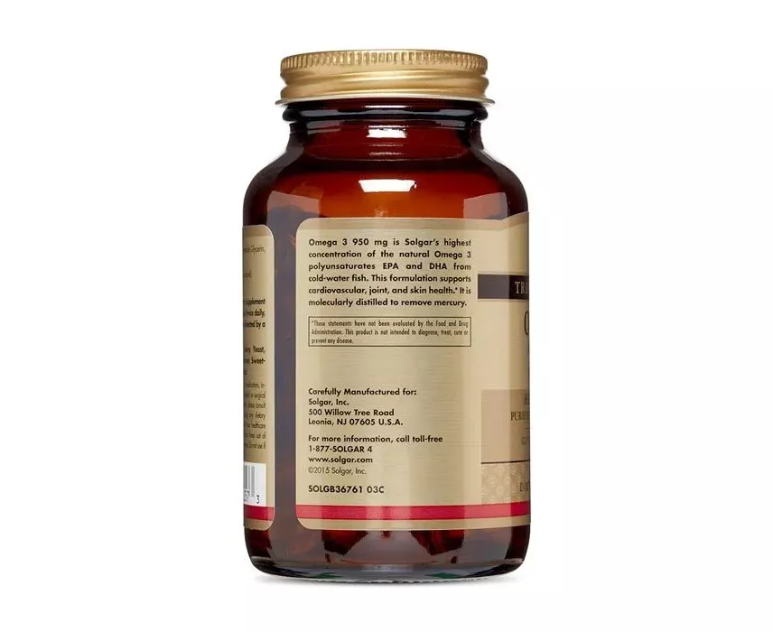 Omega 3 950 mg is Solgar's highest concentration of the natural Omega 3 polyunsaturates EPA and DHA from cold-water fish. This formulation supports cardiovascular, joint, and skin health. It is molecularly distilled to remove mercury.