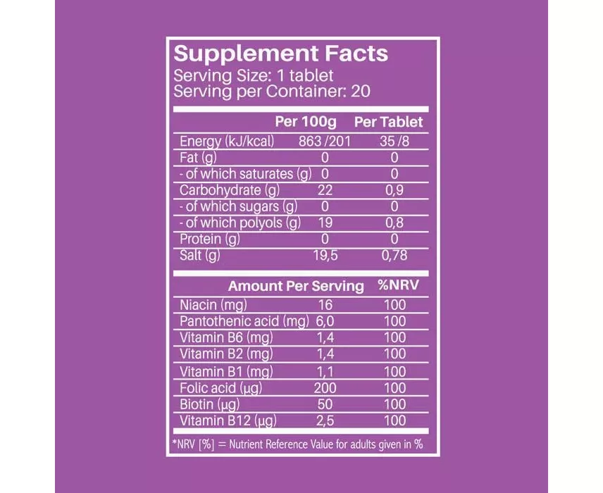 Acid (citric acid), acidity regulator (sodium hydrogen carbonate), bulking agent (sorbitol), natural flavoring (orange), sweeteners (acesulfame-K, aspartame"), color (beetroot powder), nicotinamide, calcium-D-pantothenate, riboflavin-5'-phosphate sodium, pyridoxine hydrochloride, thiamine mononitrate, pteroylmonoglutamic acid, D-biotin, cyanocobalamin It contains a source of phenylalanine.