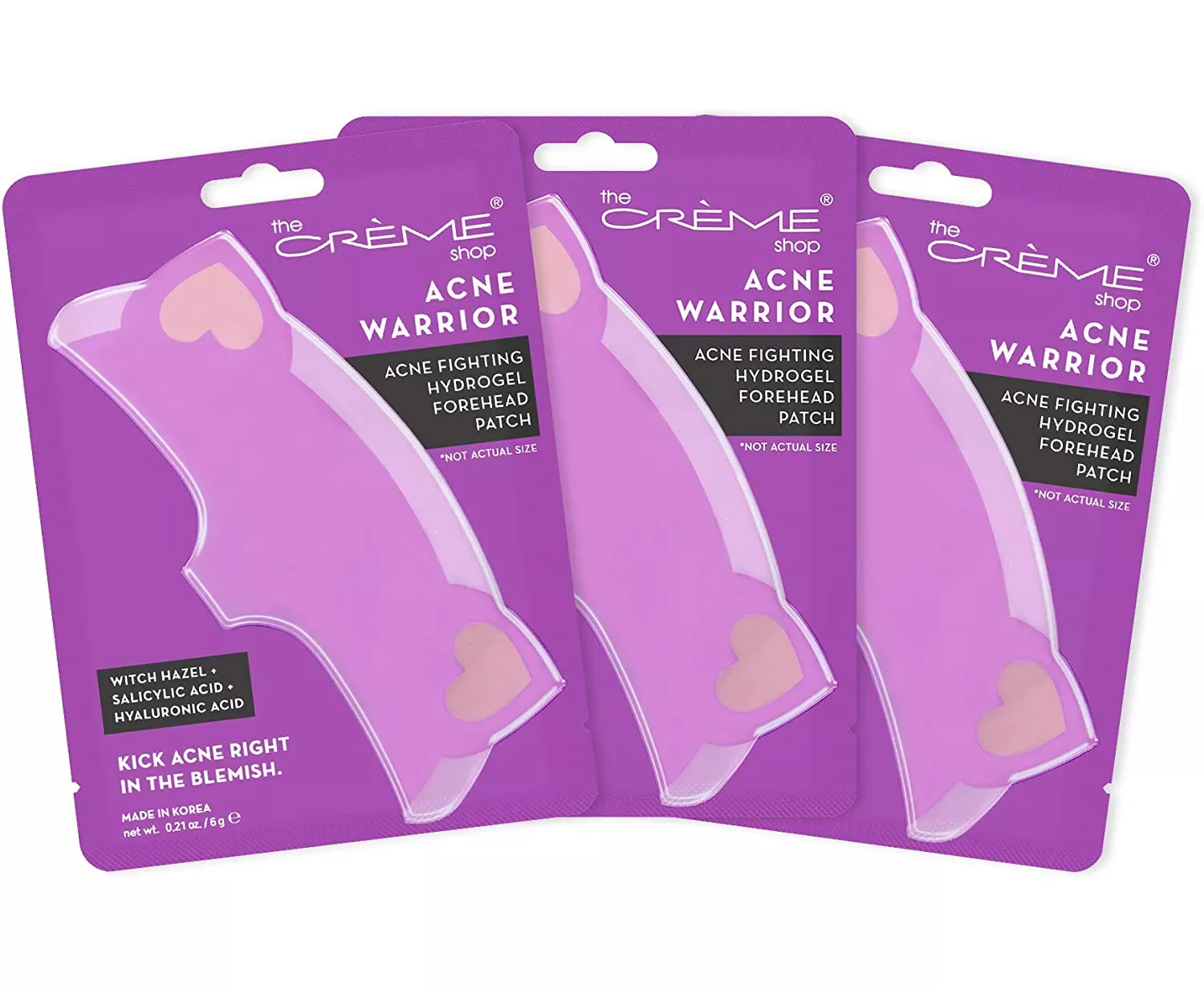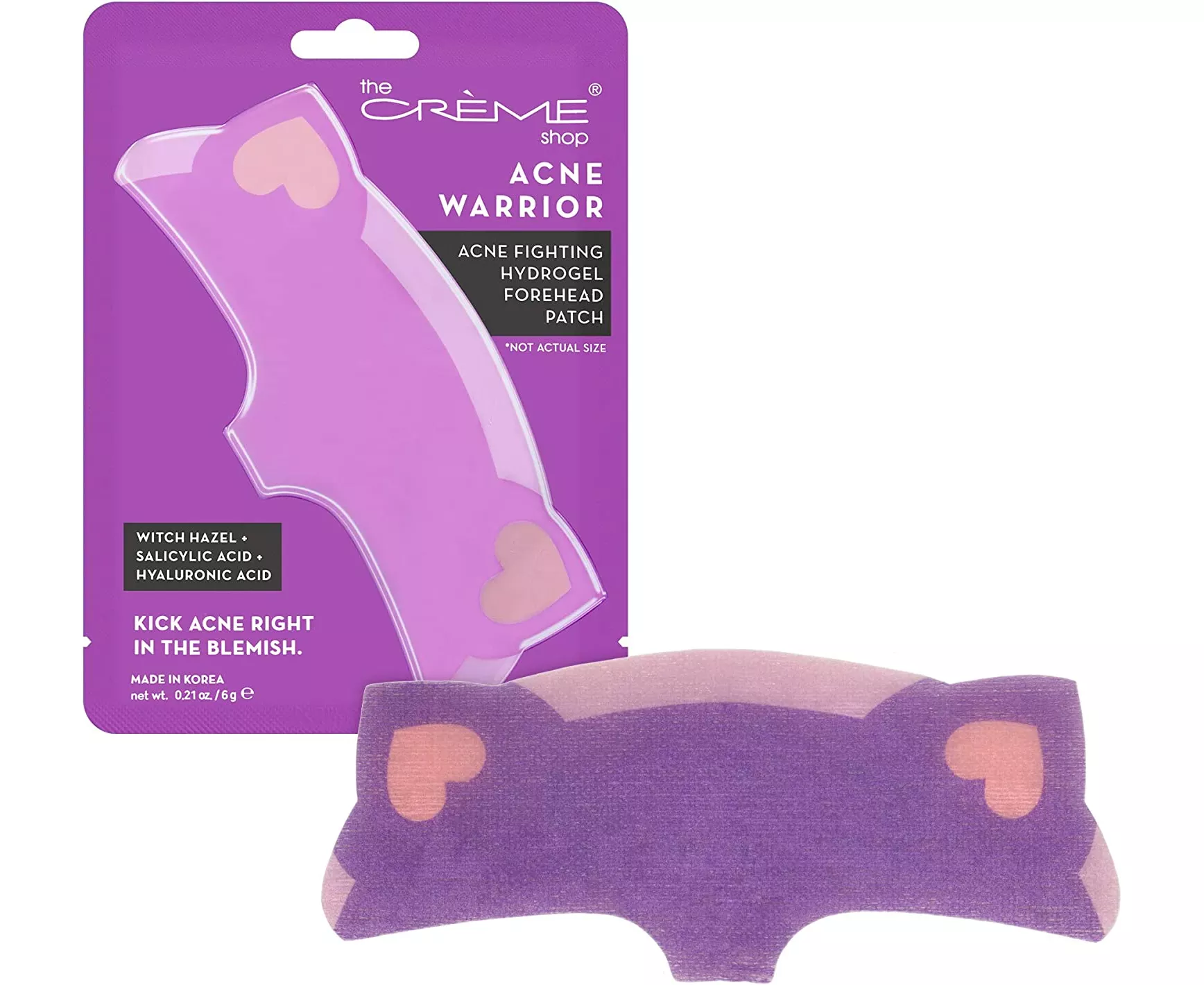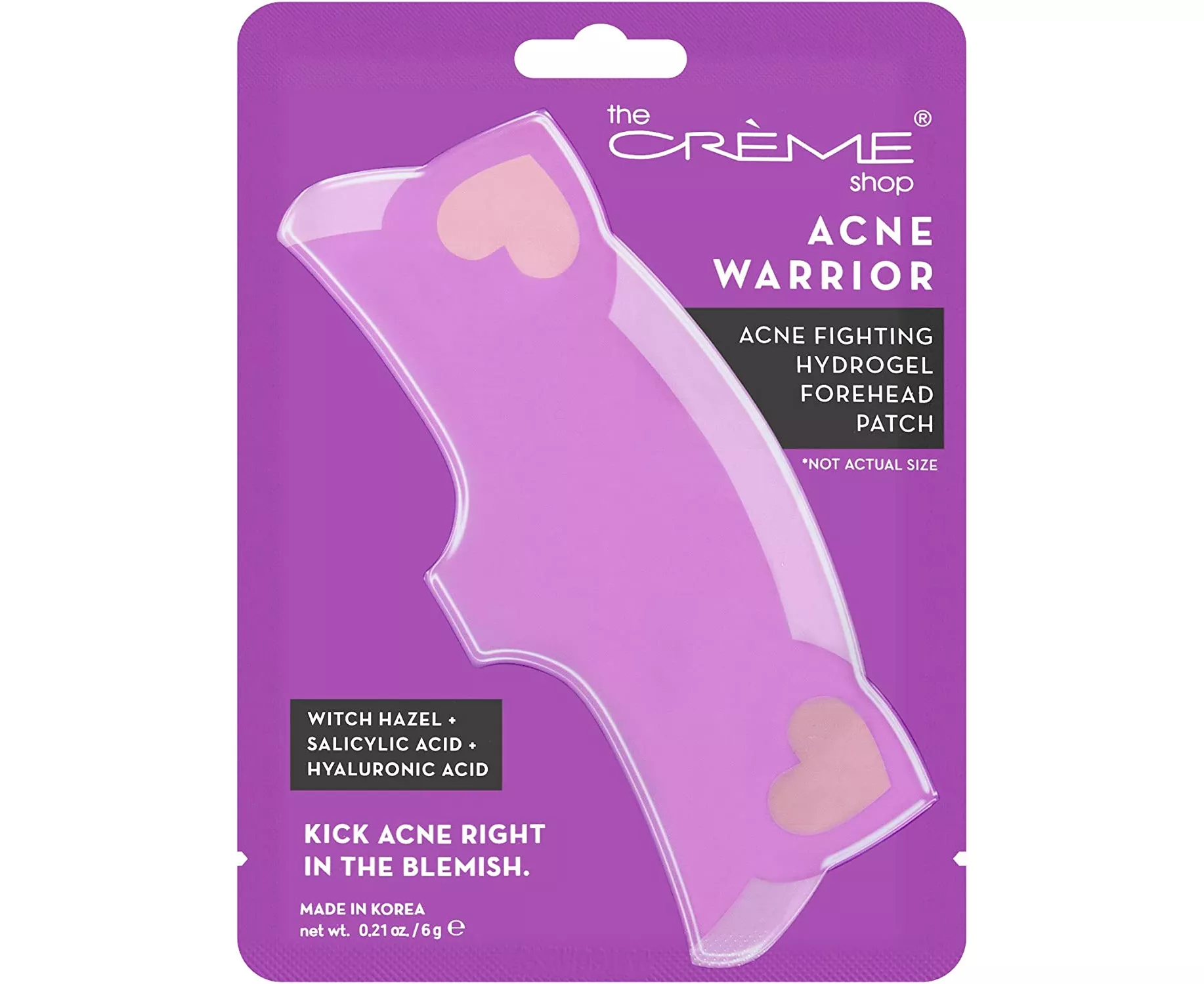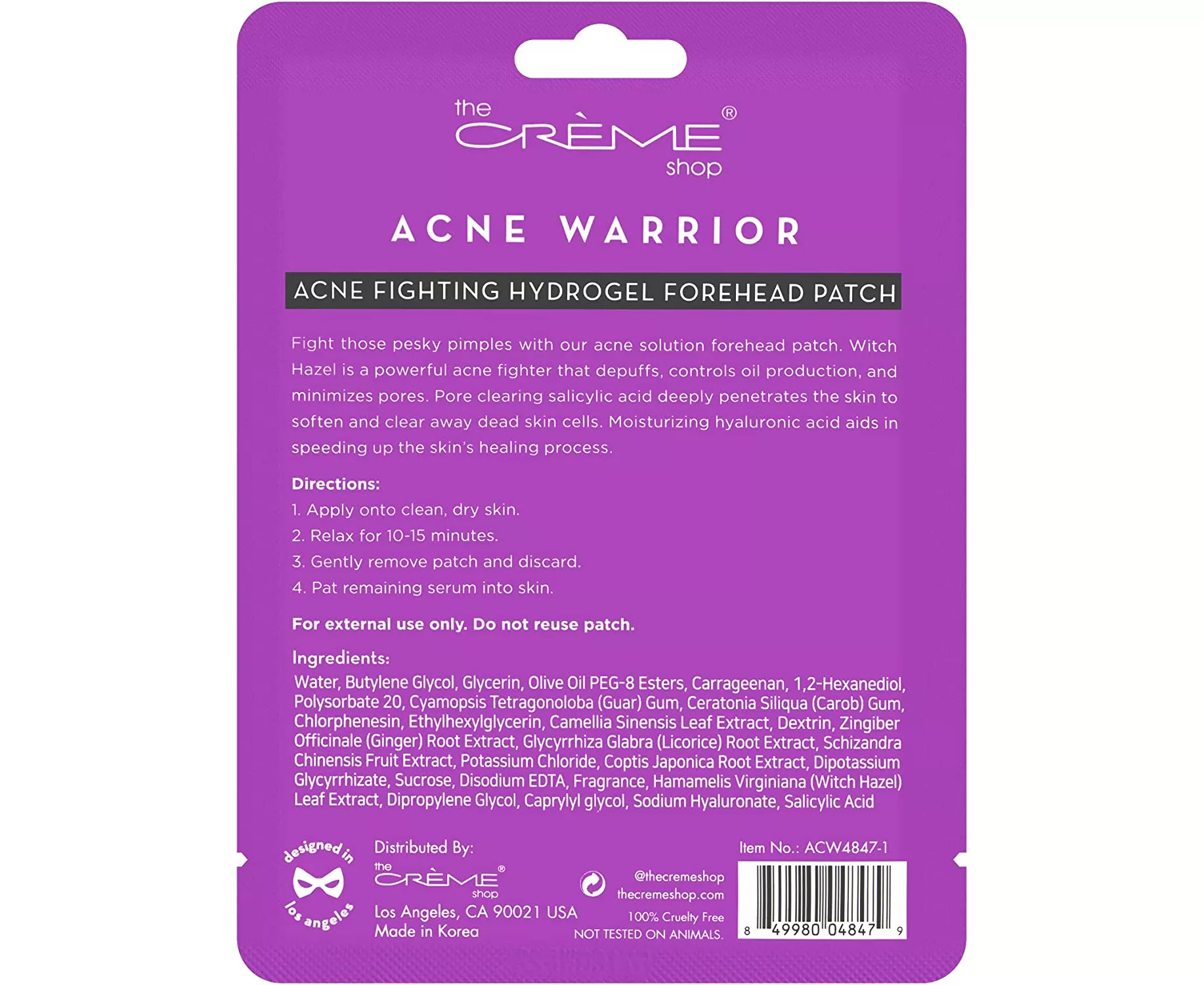The Crème Shop’s Acne Treatment Hydrogel Forehead pimple patch is made with medical-grade hydrocolloid to extract impurities and pus straight from the source. The contoured, tapered shape is designed to fit acne hot spots like your forehead, as well as your chin, and cheeks. These waterproof, protective patches speed up acne recovery by keeping bacteria and irritants away. Our K-pop inspired print makes it more fun and funkier while you relax and leave the working on us. The main ingredients of our patches are Hyaluronic Acid, Salicylic Acid and Witch Hazel, three of the most powerful combination in acne treatment and clearing your skin. Witch Hazel is a powerful acne fighter that depuffs, controls oil production, and minimizes pores. Pore clearing salicylic acid deeply penetrates the skin to soften and clear away dead skin cells, while the moisturizing benefits of hyaluronic acid aids in speeding up the skin’s healing process. Apply for 10 to 15 minutes, gently remove patch using your clean hand, pat the remaining serum into skin and voila! Wake up to flattened blemishes. Finally, get stubborn pimple clusters and zits under control.