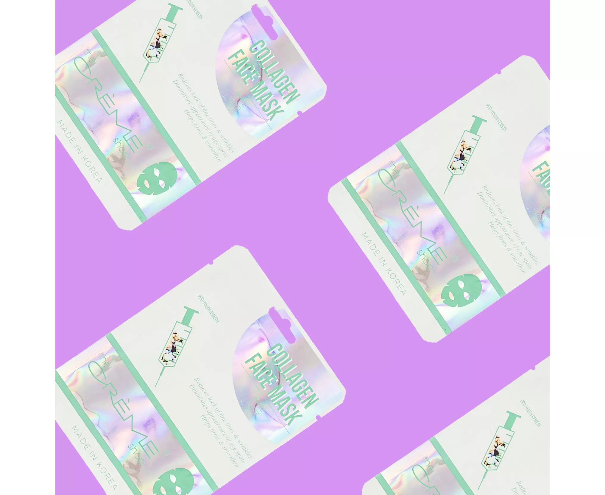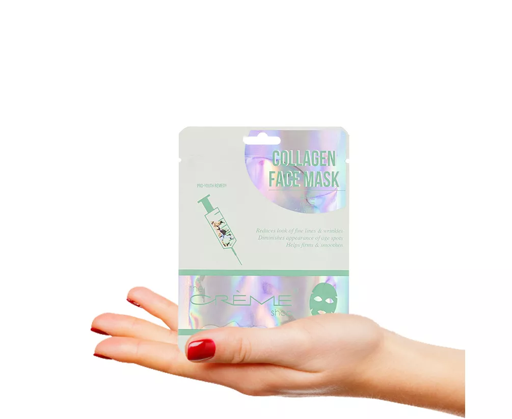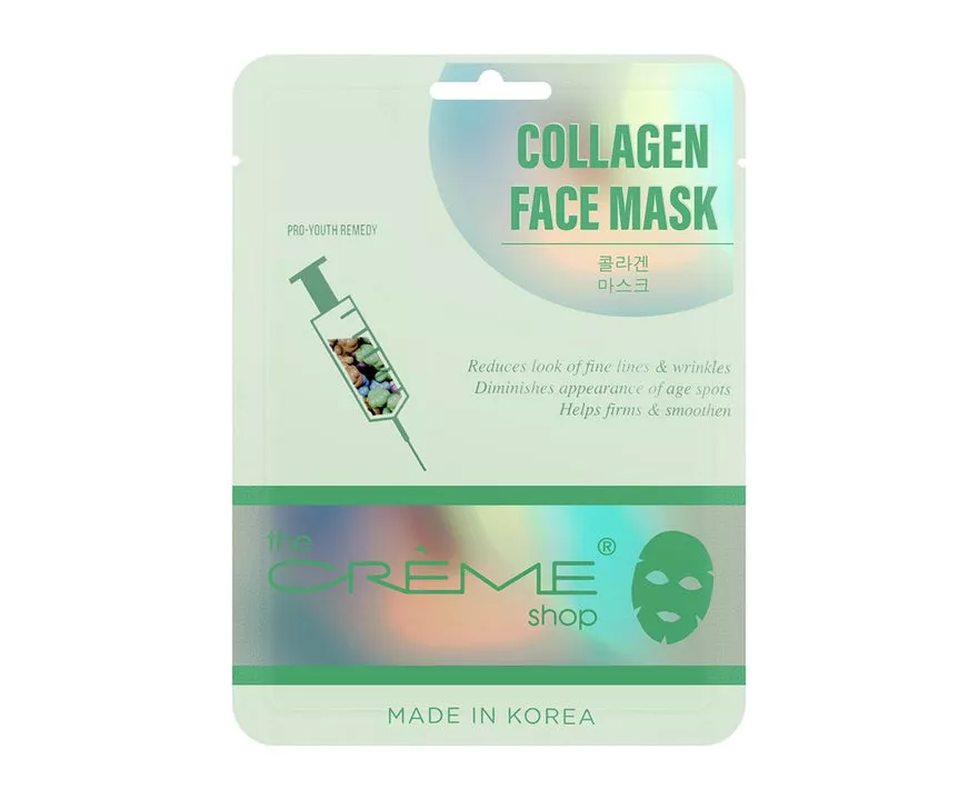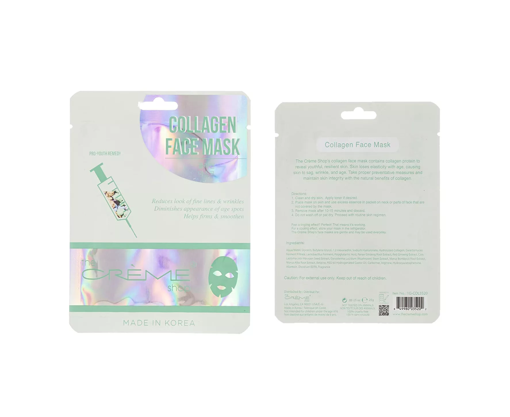Reduces look of fine lines & wrinkles. Diminishes appearance of age spots. Helps firm & smoothen The Crème Shop's collagen face mask contains collagen protein to reveal youthful, resilient skin. Skin loses elasticity with age, causing skin to sag, wrinkle, and age. Take proper preventative measures and maintain skin integrity with the natural benefits of collagen.