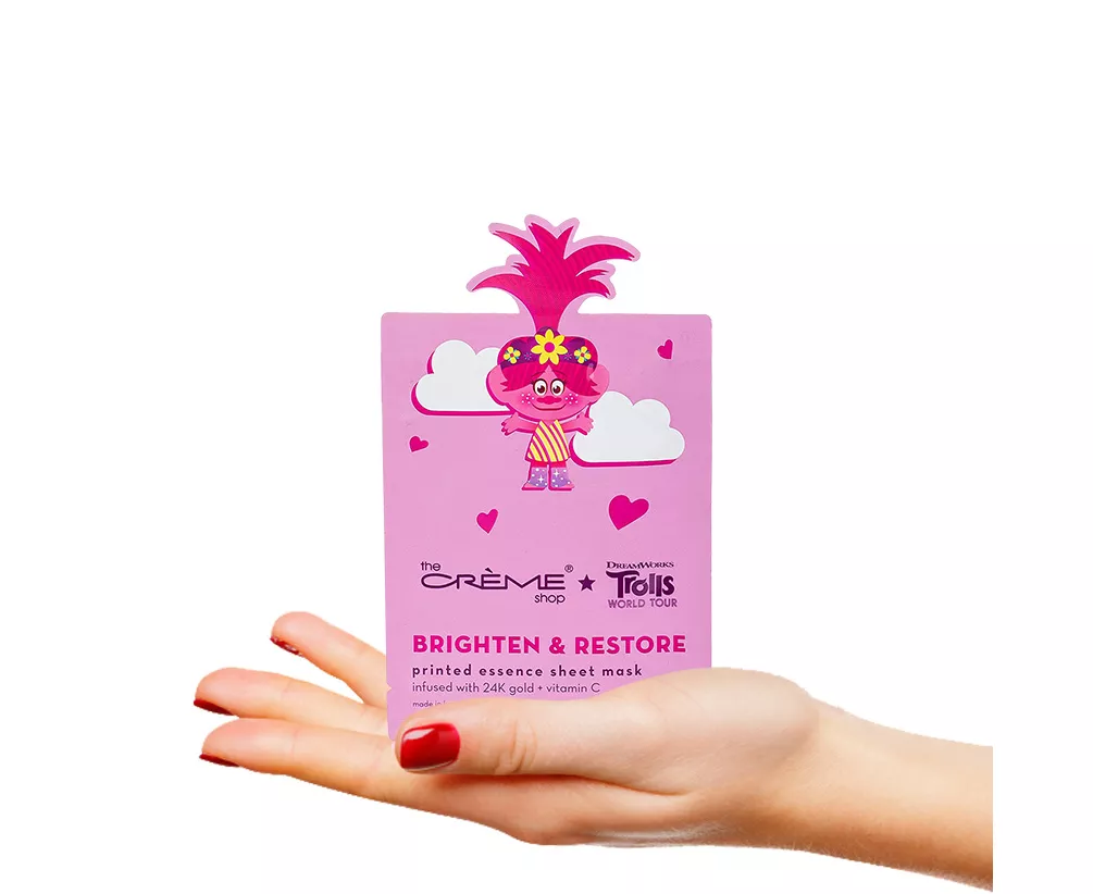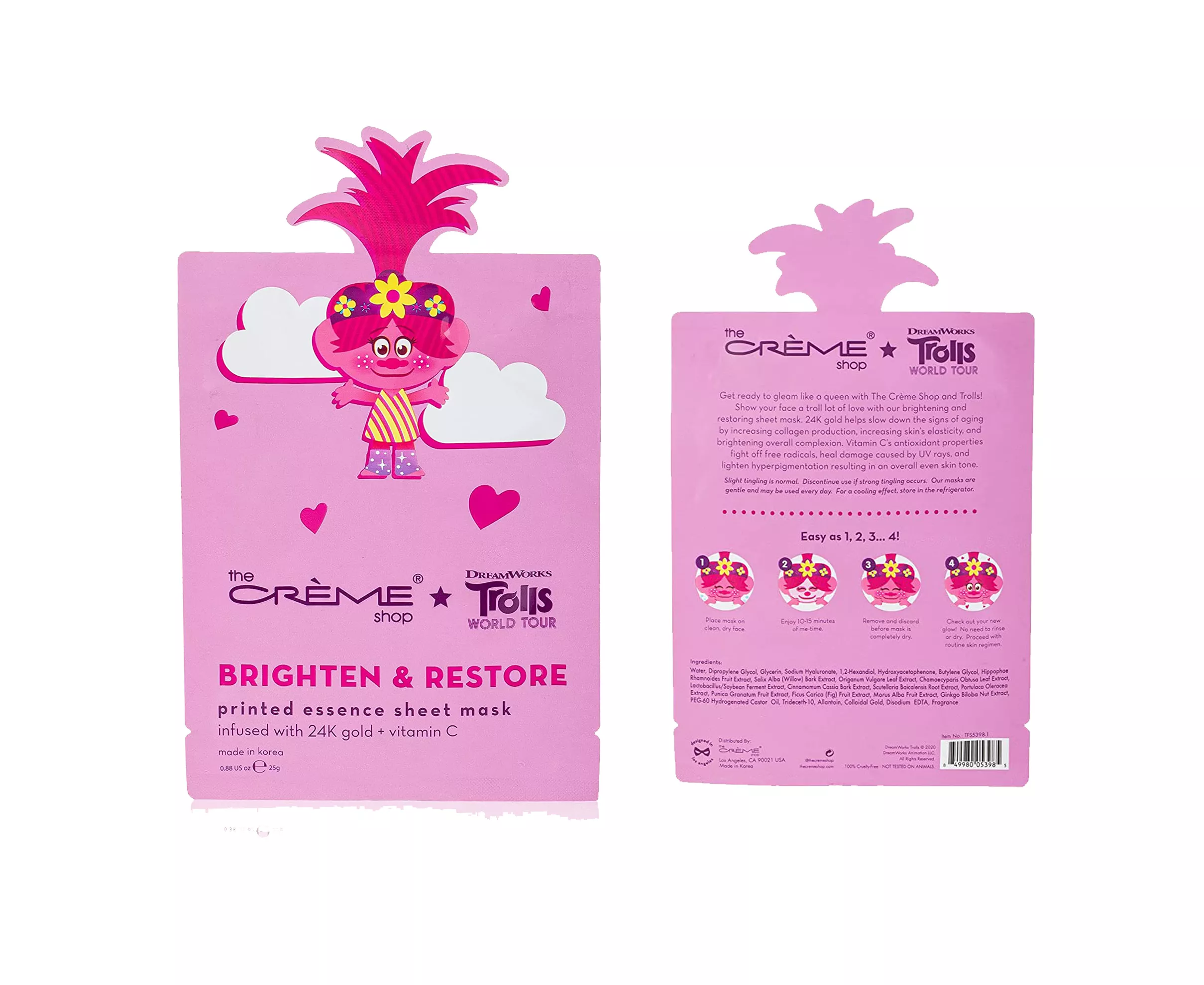 Revitalizing sheet mask infused with 24K gold + vitamin C. Mask is printed with adorable Trolls icons. Helps achieve a healthy, youthful appearance.