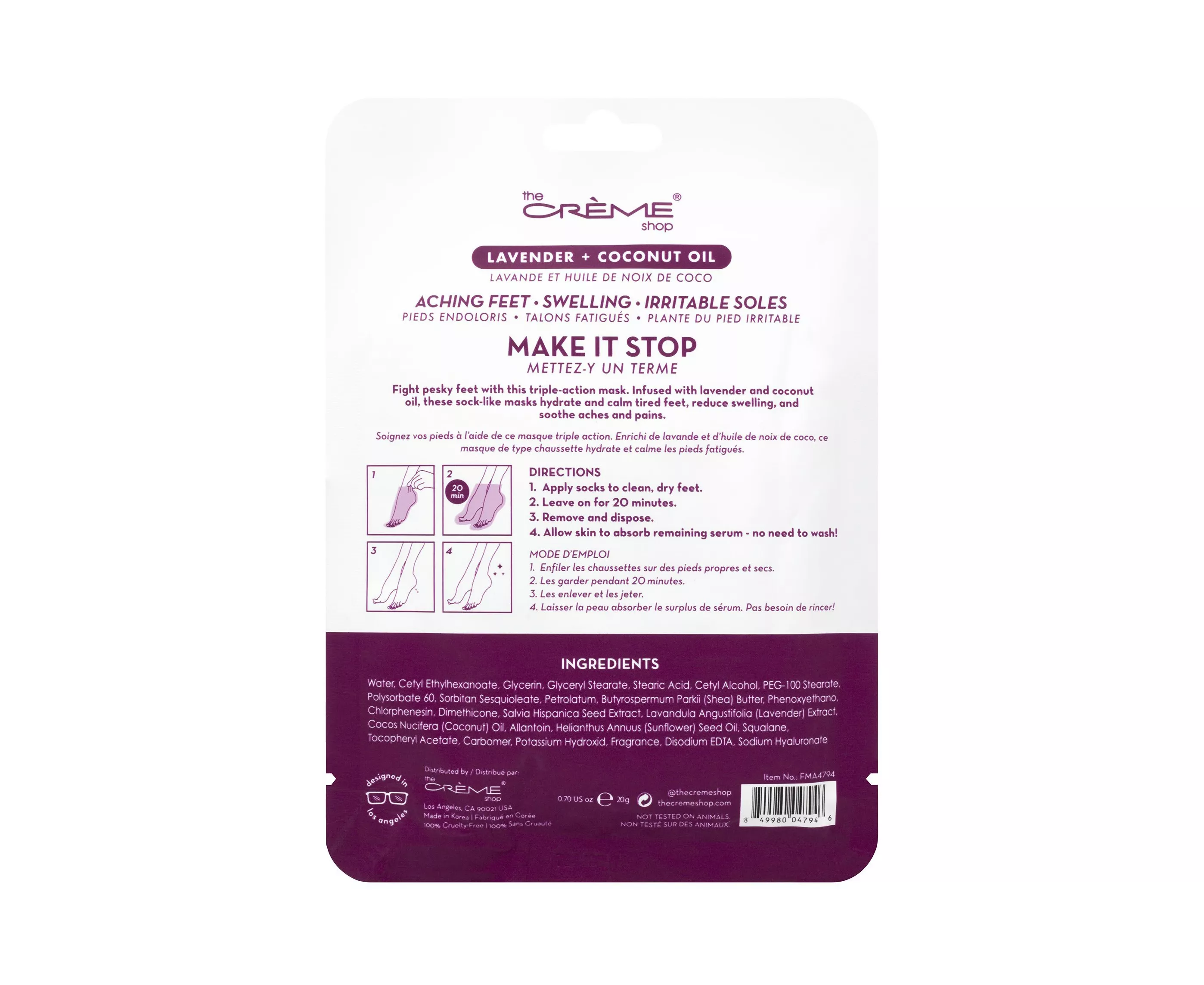 • Unique Formula: Foot masks are infused with a unique formula that helps balance skin's natural moisture barrier, containing lavender oil and coconut known to have soothing and nourishing properties