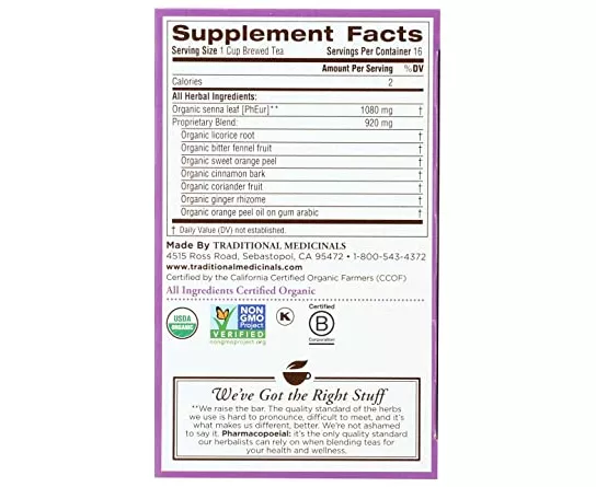 20 mg per cup Sennosides A and B (from senna leaf).InLicorice Root, Fennel Seed, Orange Peel, Cinnamon Bark, Coriander Seed, Ginger Rhizome, Natural Orange Flavor.