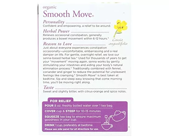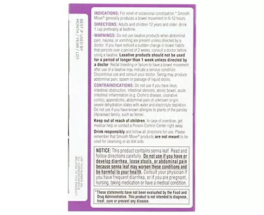 Individual needs for laxatives vary. We suggest that adults and children over the age of twelve drink one to two cups of Smooth Move before bedtime. If necessary, repeat the next day. Do not exceed four cups in a 24 hour period. Children six to under twelve years of age, drink one half cup, brewed as directed. If necessary repeat the next day . Do not exceed two cups in a 24 hour period. Children under two years of age, consult a doctor.
