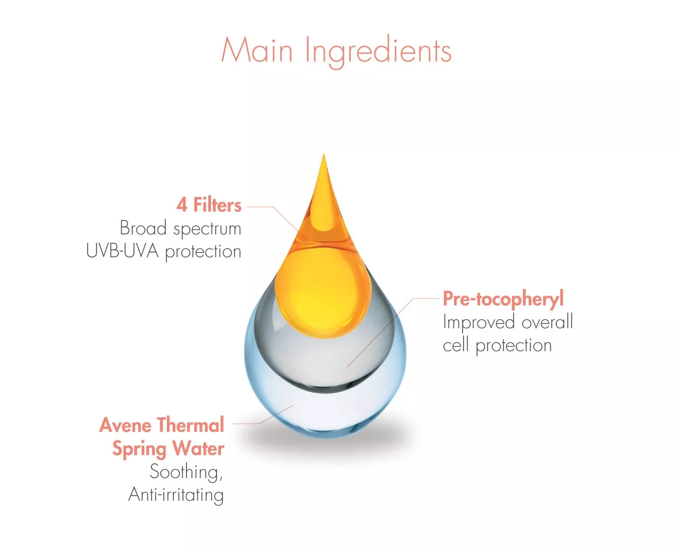 Sunscreen, very high protection for sensitive skin. Effective against all sun radiation (short and long UVB-UVA).Paraben-free Certified UVA-compliant VERY water-resistant. 100% photostable.No 1 sunscreen in the world in dermo cosmetic market. Strengths: Ideal balance between pleasure and security. Benefits from an exclusive combination of actives, “SunSitive Protection”, a product of Pierre Fabre Group Research, A complementary and synergistic photoprotective active complex, guaranteeing minimum chemical filters in our formulas. Pre-tocopheryl, a photostable Vitamin E precursor, gives additional cell protection. Avène Thermal Spring Water with natural soothing and anti-irritating properties. Light and no greasy texture : invisible, non-oily texture for particularly pleasant application. 98% protection in 4hrs. No white effect. Tamper-proof packaging.