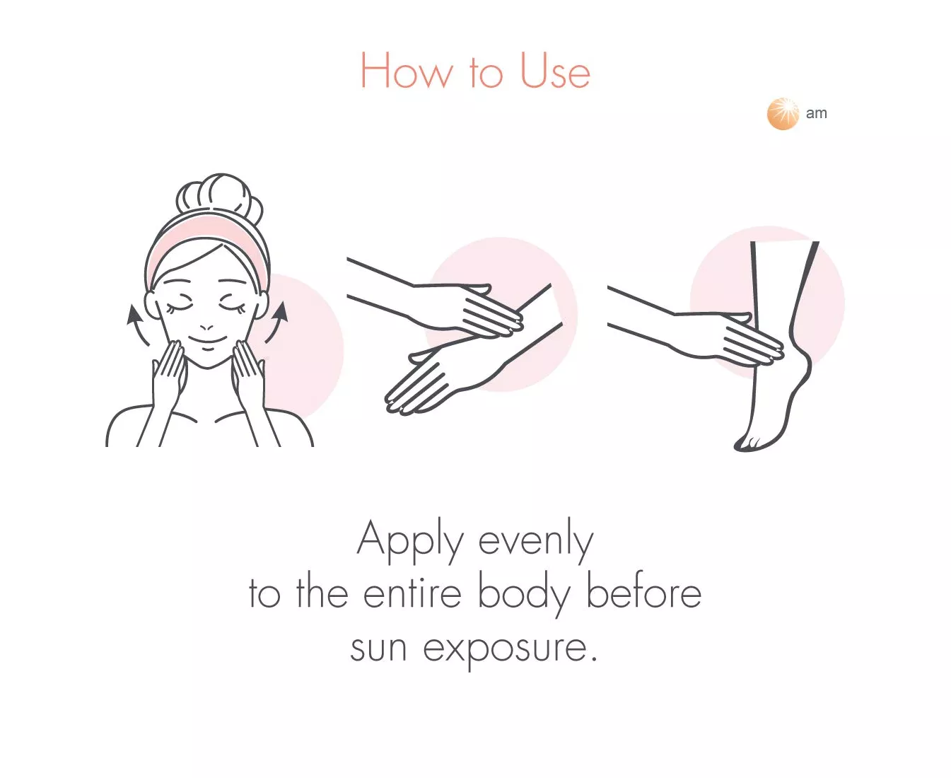 30 minutes before exposure, apply uniformly and in sufficient Quantity. Avoid exposure between midday and 4pm (maximal sunshine. uantity, Reapply frequently in case of prolonged exposure, and after swimming, Using this product should not encourage the user to prolong sun exposure. Avoid solar exposure for child between 0 and 3 years. Use clothing protection.
