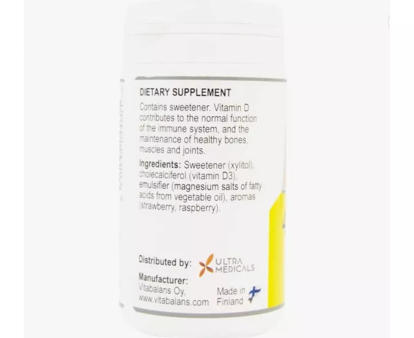 Vitamin d3 30 µg (1200 iu) sweetener (xylitol), cholecalciferol, emulsifier (magnesium salts of fatty acids) aroma (strawberry, raspberry).