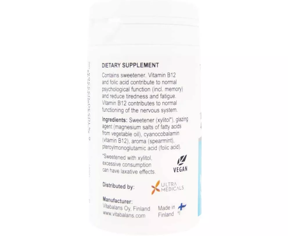 Daily dose 1 lozenge contains vitamin b12 1 mg, folic acid 400 µg, sweetener (xylitol), emulsifier (magnesium salts of fatty acids), cyanocobalamin, spearmint flavor, and pteroylmonoglutamin acid.