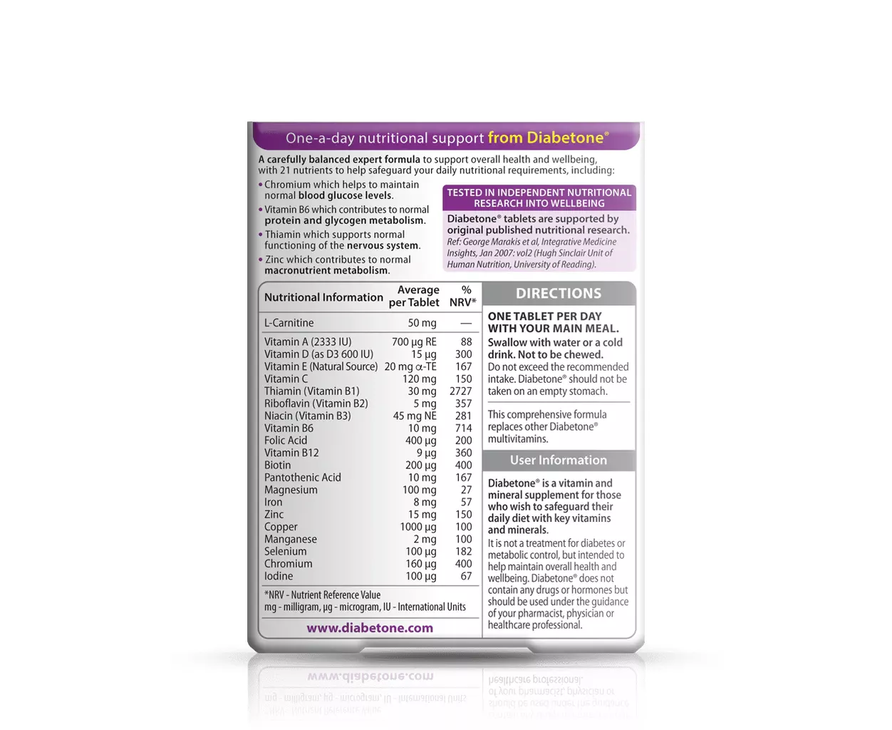Managing your food choices and eating habits can have a direct influence on your overall wellbeing. Eating a balanced diet, managing your weight and following a healthy lifestyle are vital and can all have a positive effect. In addition, taking a supplement such as Diabetone can help safeguard your daily intake of key micronutrients.