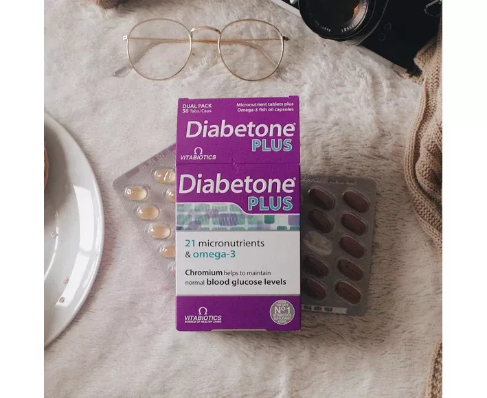 Diabetone is a multivitamin by Vitabiotics that has been specifically formulated to safeguard the nutritional requirements of those with diabetes. These multivitamins contain chromium which contributes to the maintenance of normal blood glucose levels, vitamin B6 for protein and glycogen metabolism and thiamin (vitamin B1) which contributes to the normal functioning of the nervous system. Diabetone Plus contains 28 Diabetone multivitamin tablets and 28 omega-3 capsules. These vitamins are not a treatment for diabetes or metabolic control - they are intended to help maintain overall nutritional health and wellbeing.