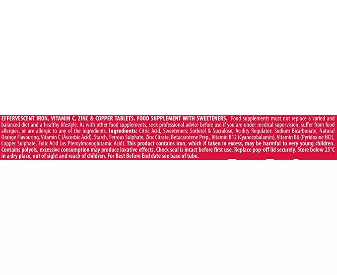 Citric Acid, Sweeteners: Sorbitol & Sucralose, Acidity Regulator: Sodium Bicarbonate, Natural Orange Flavouring, Vitamin C (Ascorbic Acid), Starch, Ferrous Sulphate, Zinc Citrate, Betacarotene Prep., Vitamin B12 (Cyanocobalamin), Vitamin B6 (Pyridoxine HCl), Copper Sulphate, Folic Acid (as Pteroylmonoglutamic Acid)