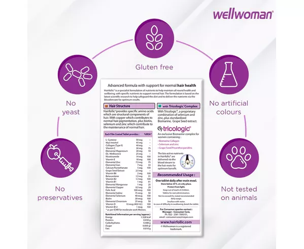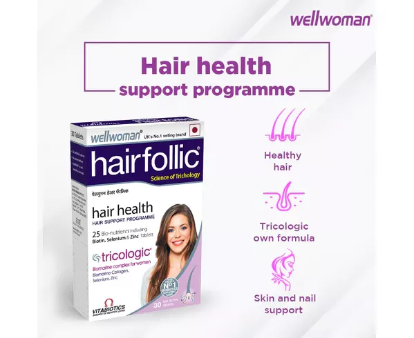 Wellwoman Hairfollic hair supplements for women is our innovative combination of 25 bio nutrients, including biotin, selenium and zinc that contribute to the maintenance of healthy hair. Wellwoman Hairfollic provides Advanced Hair Nutrition for Women with exclusive Bio-marine collagen complex for Women along with amino acids & natural antioxidants specifically designed to regenerate dormant hair follicles & maintain scalp health.