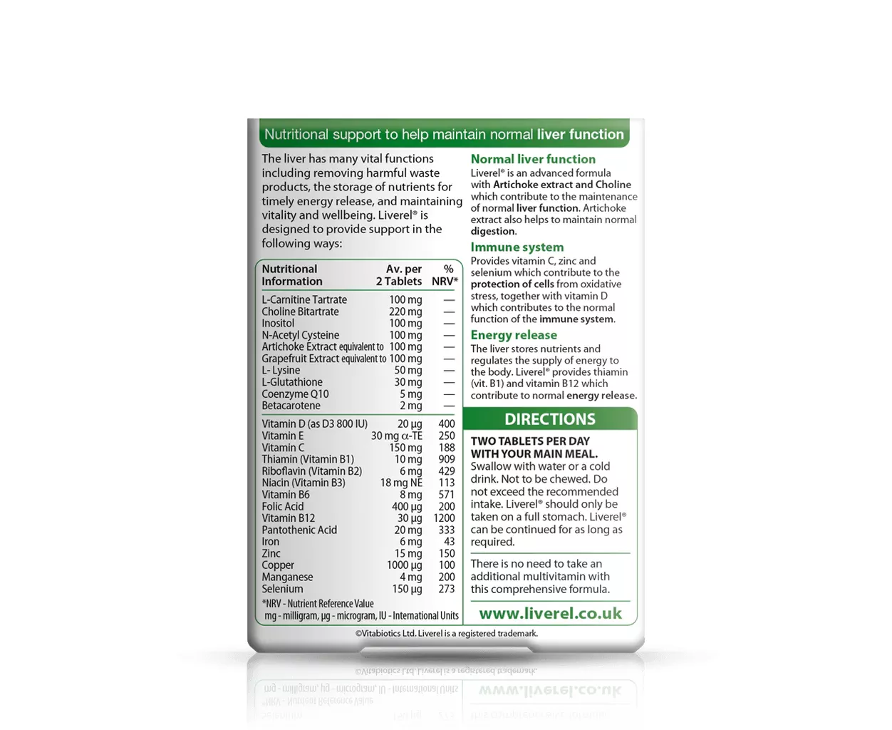 Liverel is the first and only supplement to combine Artichoke Extract with N-acetylcysteine, Choline, L-Carnitine and L-Glutathione, as well as other vitamins and trace minerals. Liverel is the first and only supplement to combine Artichoke Extract with N-acetylcysteine, Choline, L-Carnitine and L-Glutathione, as well as other vitamins and trace minerals. Liverel is a sensibly balanced, moderate level multivitamin, mineral and botanical formulation, with Artichoke Extract and choline. Choline helps maintain normal liver function. Body systems such as the liver, function at their best in the presence of adequate nutrition. Supplementation may be of particular benefit in those individuals who are failing to achieve the NRV intake levels every day.