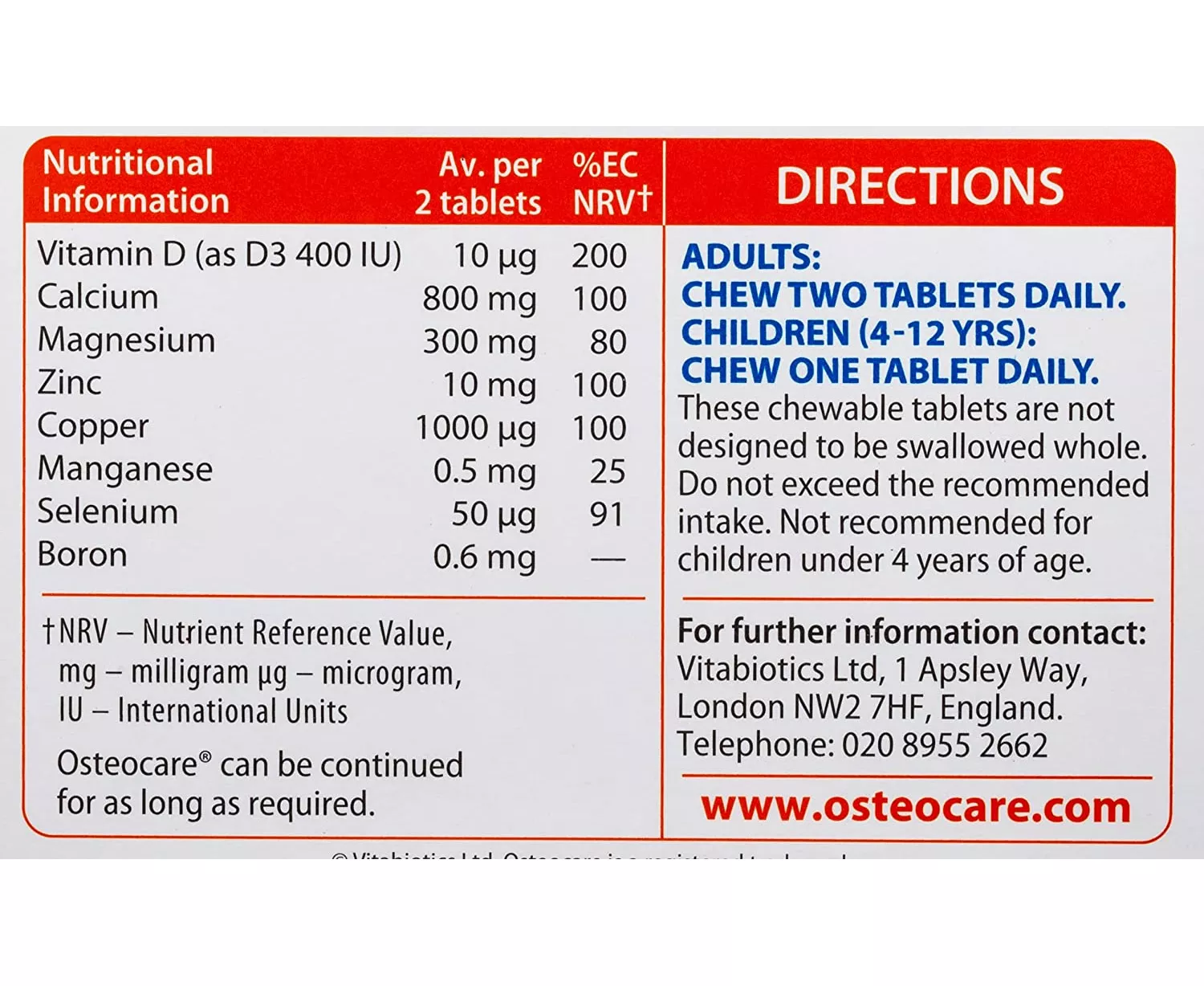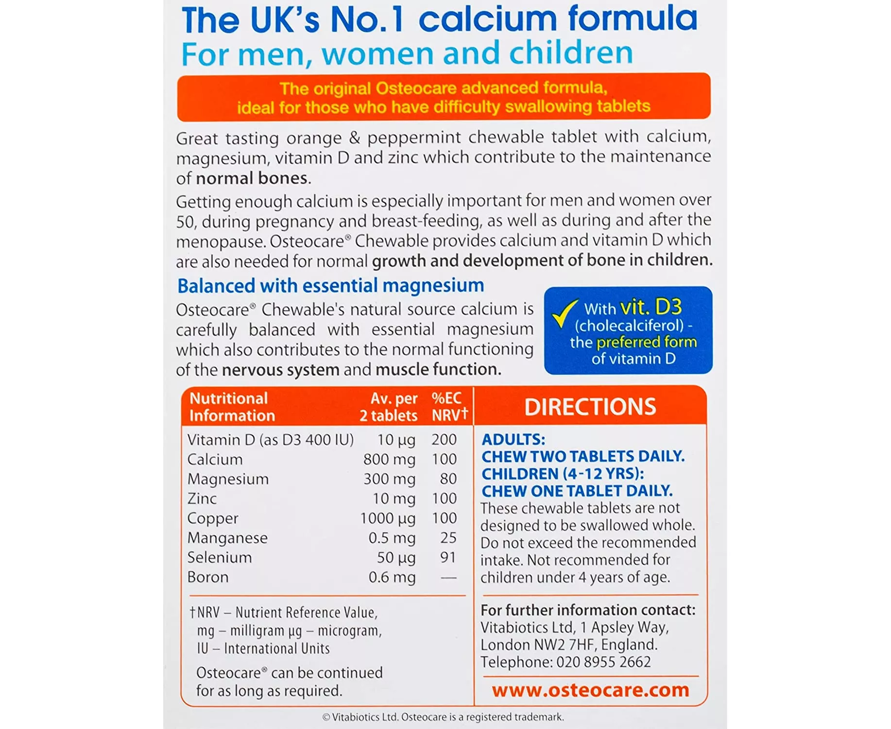 Osteocare is the UK's no.1 calcium formula for men, women and children. It has been scientifically developed on the basis of the very latest research to provide a rich source of calcium and co-factors including vitamin D which helps with the normal absorption of calcium by the body in a great tasting orange & peppermint chewable tablet.