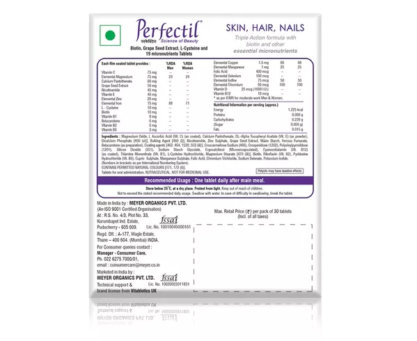 Perfectil is a triple active supplement for skin, hair and nails with 22 micronutrients including biotin, zinc and selenium, which does not contain artificial colours, preservatives, lactose, yeast or gelatin, gluten-free and not tested on animals.complement your daily skin and hair care routine with a range of over 22 micronutrients.