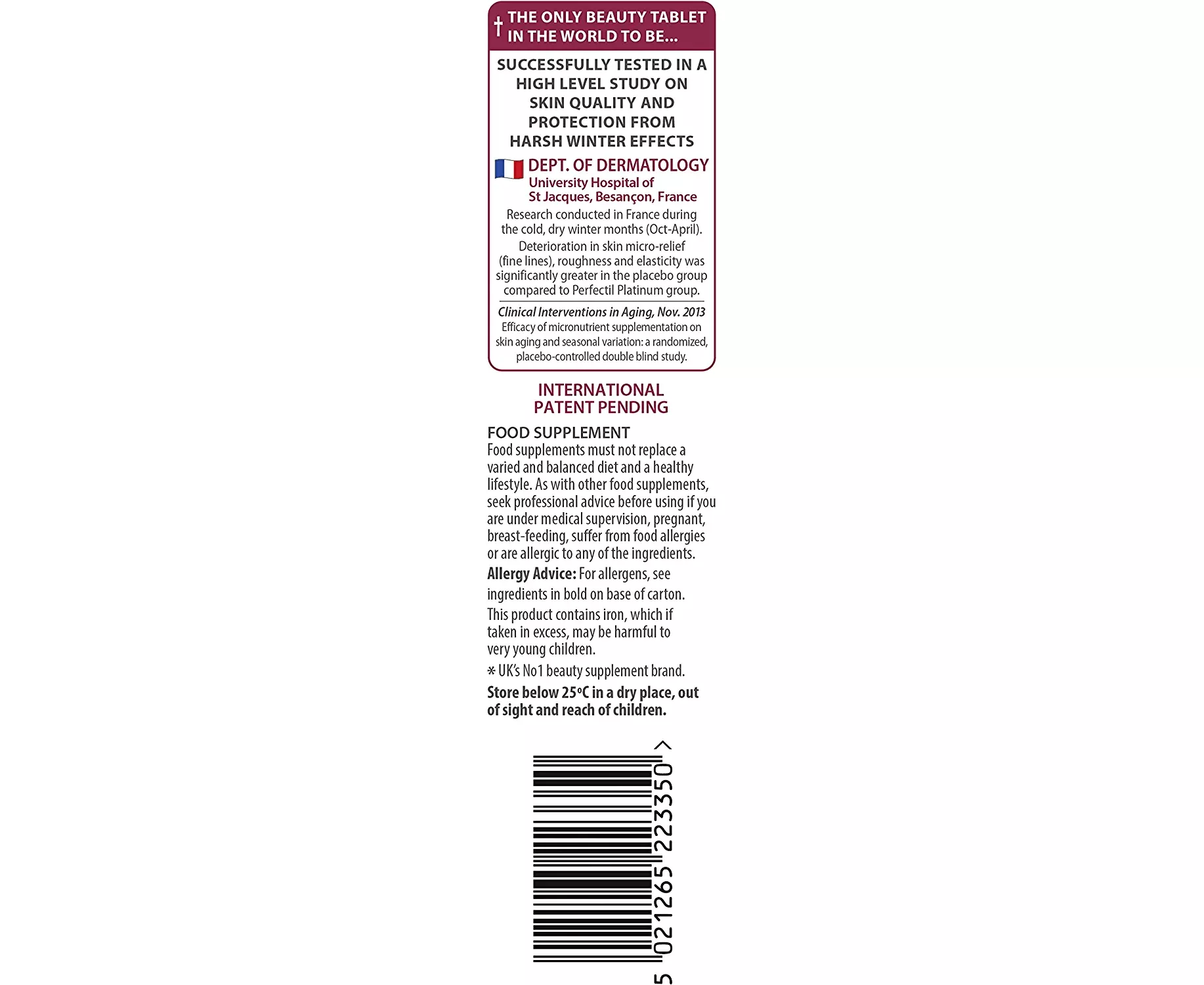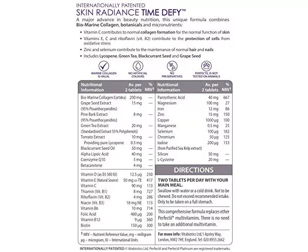 Perfectil Platinum helps refine, nourish and protect ageing skin by delivering a powerful combination of bio-active ingredients including high-grade marine collagen complex, pine bark extract, black currant seed oil, lycopene and alpha-lipoic acid directly to the lower layer of the skin.