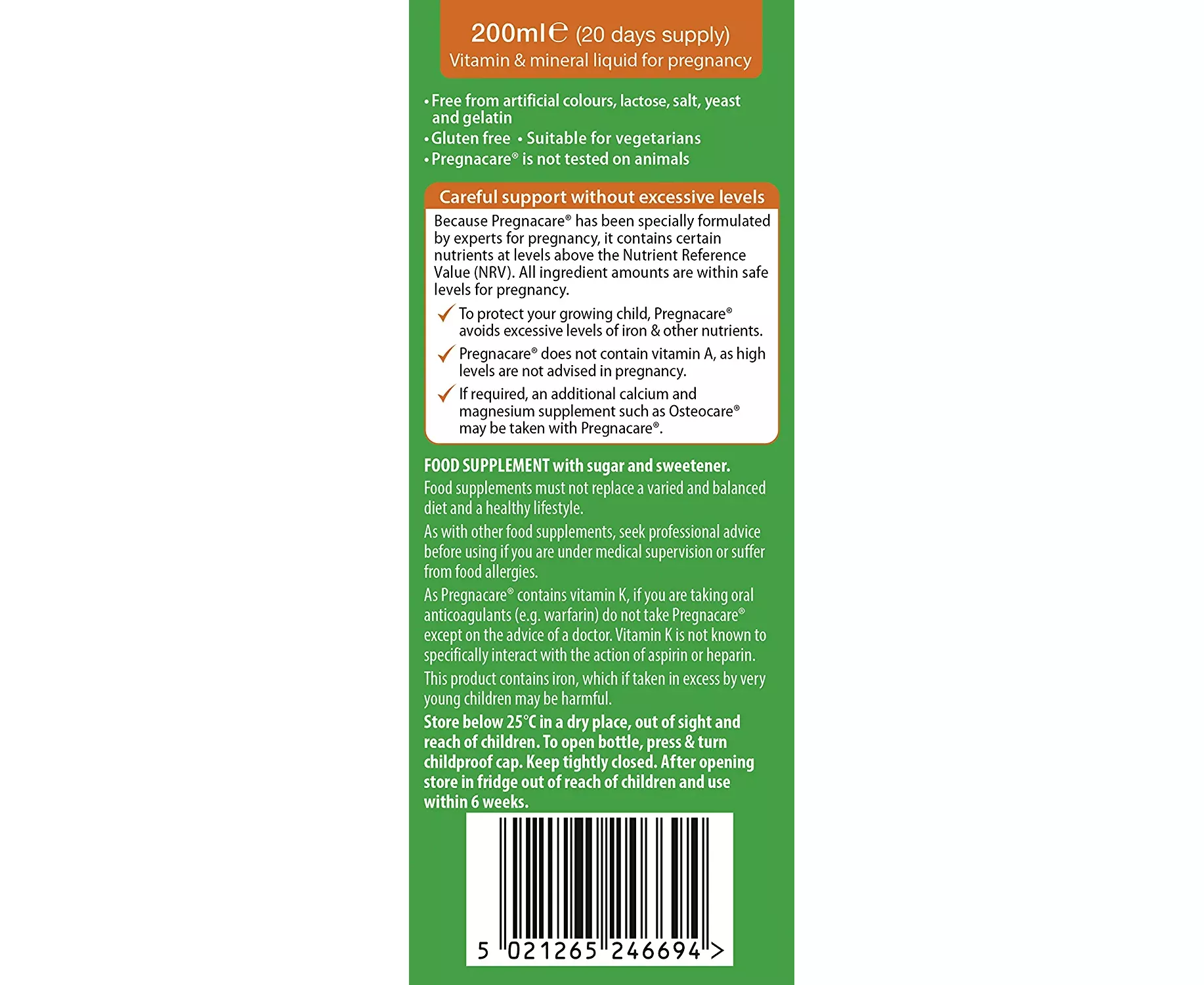 Safeguard your diet with a carefully formulated liquid supplement containing the essential nutrients for pregnancy. Gentle on the stomach and an ideal alternative to tablets, in a great tasting orange flavor. From Pregnacare - the UK’s No.1 pregnancy supplement brand. Pregnacare is the UK's most popular pregnancy supplement brand, and is trusted by mums to safeguard the diet throughout pregnancy. Pregnacare Liquid is a scientifically developed formulation of 18 important vitamins and minerals, including 400µg folic acid and 10µg vitamin D, the exact levels as recommended by the UK Department of Health. Pregnacare Liquid has been carefully developed by experts so that all ingredient levels are within safe levels for pregnancy and are moderate rather than excessive.