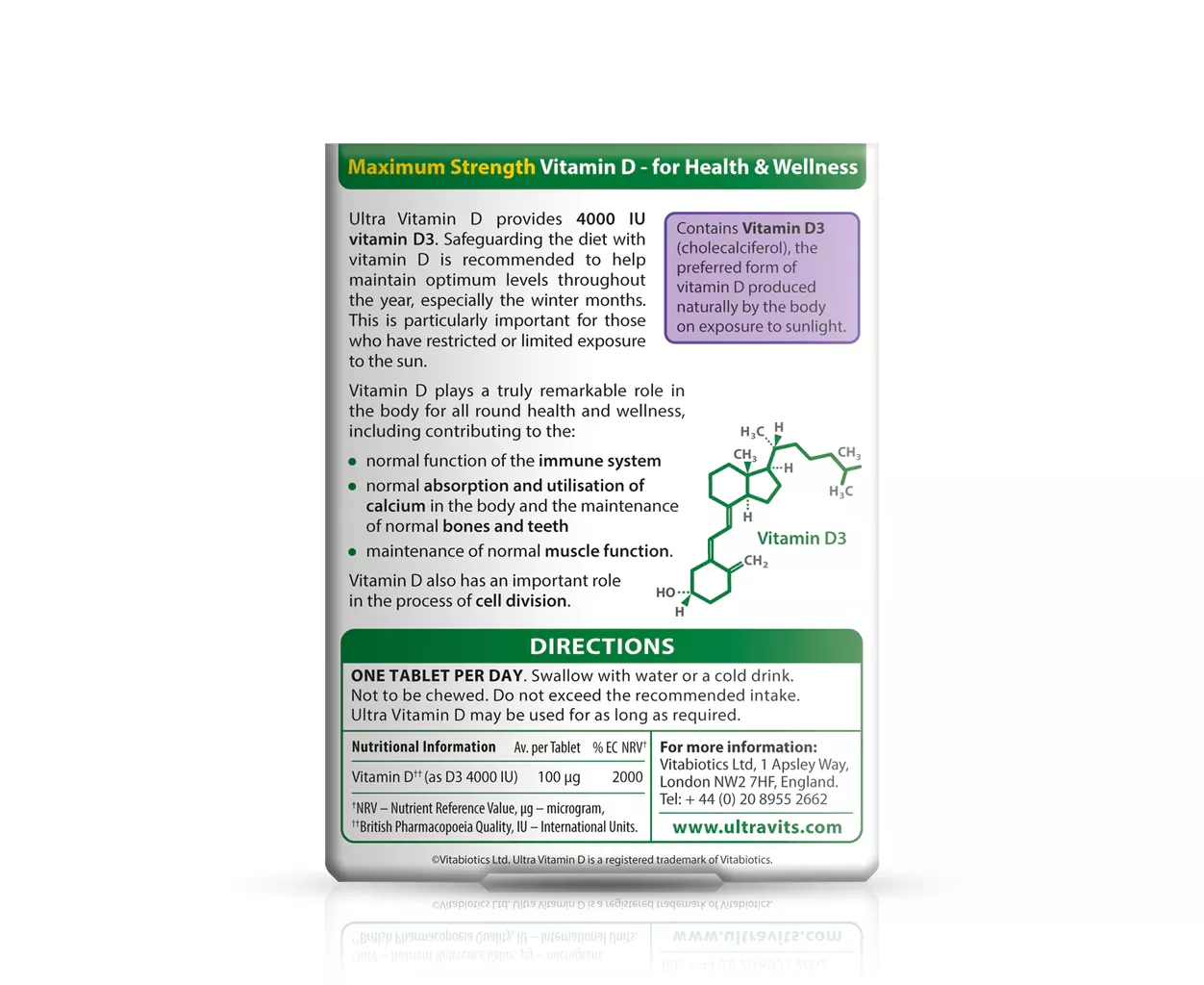 Ultra Vitamin D provides maximum strength vitamin D, a nutrient that plays a truly remarkable role in the body and is important for many areas of health. It not only contributes to the maintenance of normal bones and teeth but is also known for its role in supporting normal function of the immune system, normal cell division and normal muscle function. Vitamin D is synthesized by the body on exposure to sunlight. However, many areas of the world receive insufficient sunlight and even in sunny areas, many choose to limit their exposure due to the negative health effects of excessive exposure to the sun's UV rays. These factors have led to widespread low vitamin D levels in many parts of the world.
