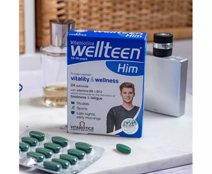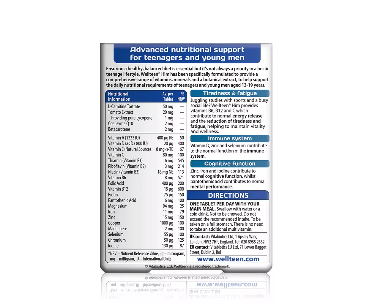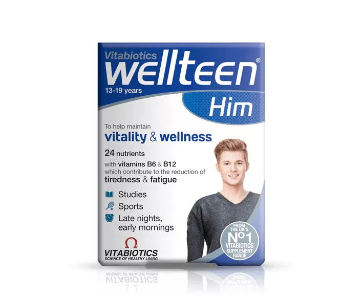 Today's young adults have more to live up to than ever before, with busy social lives, late nights and early mornings, studying and sports to juggle. Ensuring a healthy, balanced diet is essential but it's not always a priority in a hectic teenage lifestyle. Wellteen Him has been developed especially for teenagers and young men aged 13-19 years, it provides a comprehensive range of vitamins, minerals, Co-Q10 and botanical extract, Lycopene, to help support daily nutritional requirements.From studies to sports, Wellteen Him provides a broad range of important vitamins and minerals for increasingly hectic lifestyles.
