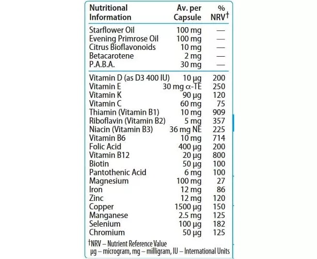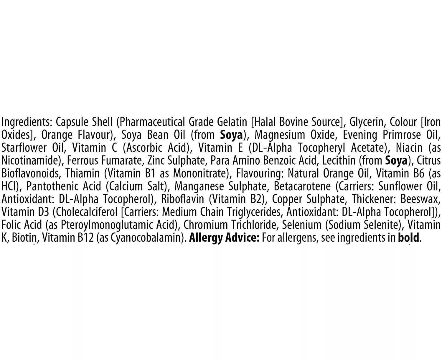 Capsule Shell (Pharmaceutical Grade Gelatin [Halal Bovine Source], Glycerin, Natural Source Colour [Iron Oxides], Orange Flavour), Soya Bean Oil (from Soya), Magnesium Oxide, Evening Primrose Oil, Starflower Oil, Vitamin C (Ascorbic Acid), Vitamin E (DL-Alpha Tocopheryl Acetate), Niacin (as Nicotinamide), Ferrous Fumarate, Zinc Sulphate, Para Amino Benzoic Acid, Lecithin (from Soya), Citrus Bioflavonoids, Thiamin (Vitamin B1 as Mononitrate), Vitamin B6 (as HCl), Flavouring: Natural Orange Oil, Pantothenic Acid (Calcium Salt), Manganese Sulphate, Betacarotene (Carriers: Sunflower Oil, Antioxidant: DL-Alpha Tocopherol), Riboflavin (Vitamin B2), Copper Sulphate, Thickener: Beeswax, Folic Acid (as Pteroylmonoglutamic Acid), Vitamin D3 (Cholecalciferol [Carriers: Medium Chain Triglycerides, Antioxidant: DL-Alpha Tocopherol]), Chromium Trichloride, Selenium (Sodium Selenite), Vitamin K, Biotin, Vitamin B12 (as Cyanocobalamin).