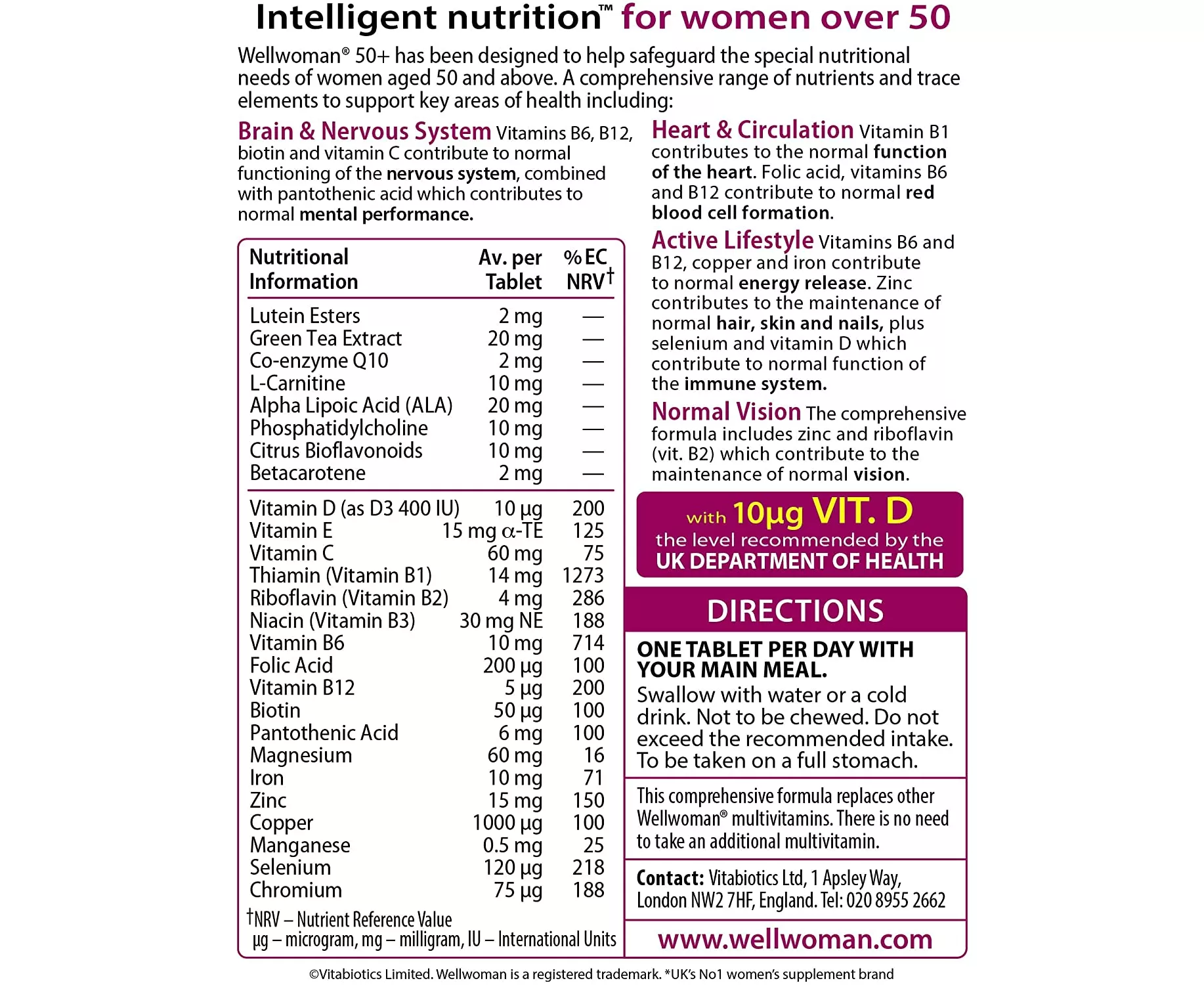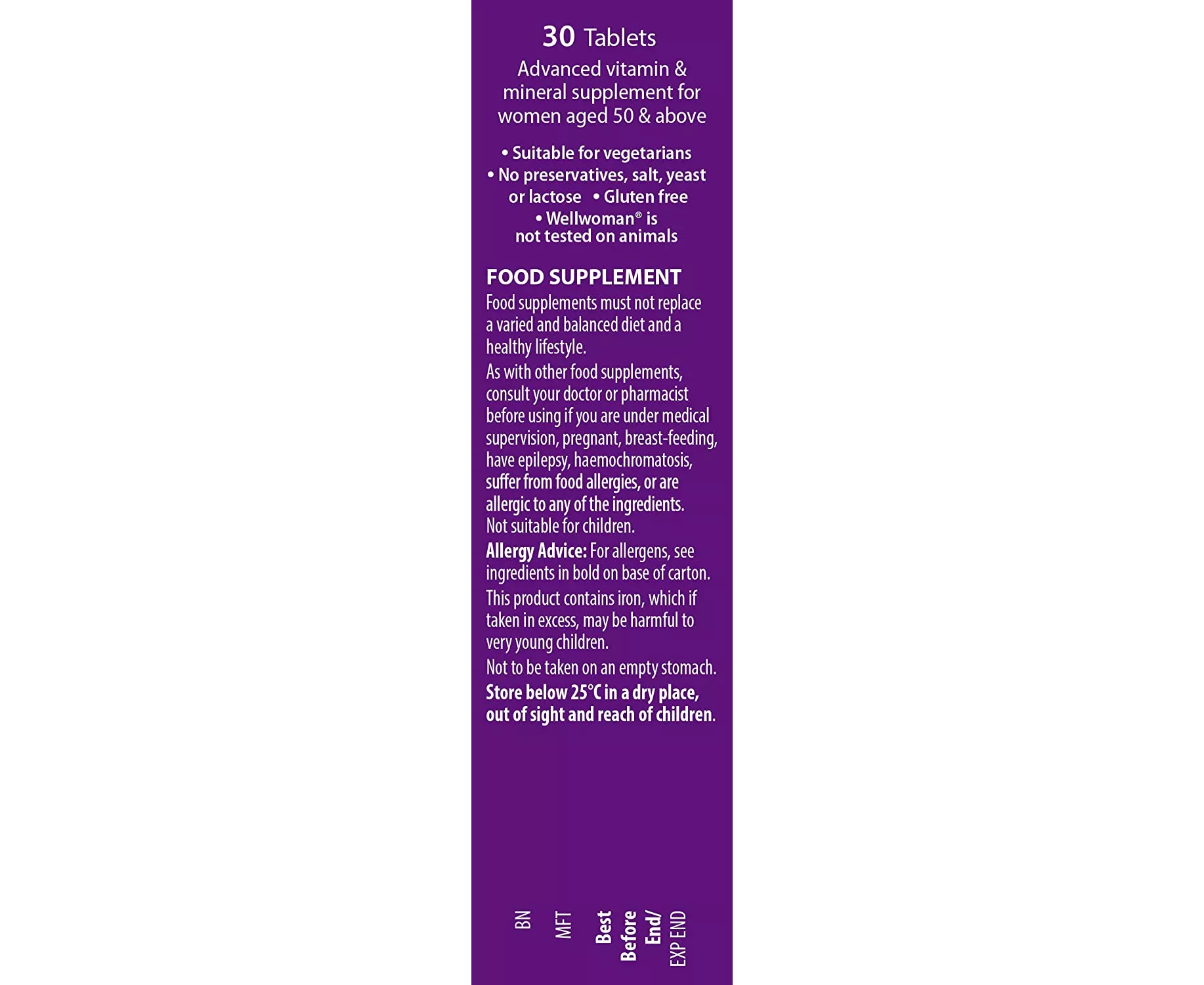 Wellwoman 50+ has been specifically designed to help safeguard the nutritional needs of women aged 50 and above and forms part of the Wellwoman range, the UK's number 1 women's supplement brand. There is now a great deal of research evidence to suggest that micronutrient supplementation in individuals aged over 50 can be beneficial. Wellwoman 50+ contains a comprehensive range of 26 vitamins, minerals and plant derived nutrients to support key areas of health important to women over 50, including heart, brain and eye health.