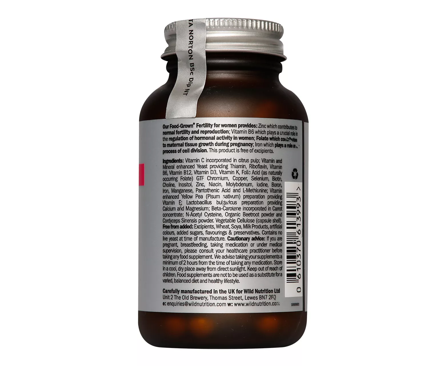 Wild Nutrition Women's Food-Grown® Fertility for women is a comprehensive blend of Food-Grown® nutrients and whole-food concentrates expertly formulated to support preconception and preparation for pregnancy. Our bespoke formula focuses on key ingredients demonstrated through research to support a healthy conception whether naturally or through assisted conception including Zinc which contributes to normal cell division and DNA sythesis; Vitamin B12, Iron, Magnesium, Selenium and Vitamin D to contribute to healthy cell division, provide protection against cell damage and support immune health; Folic Acid (providing naturally occurring Folate), which contributes to maternal tissue growth during pregnancy.