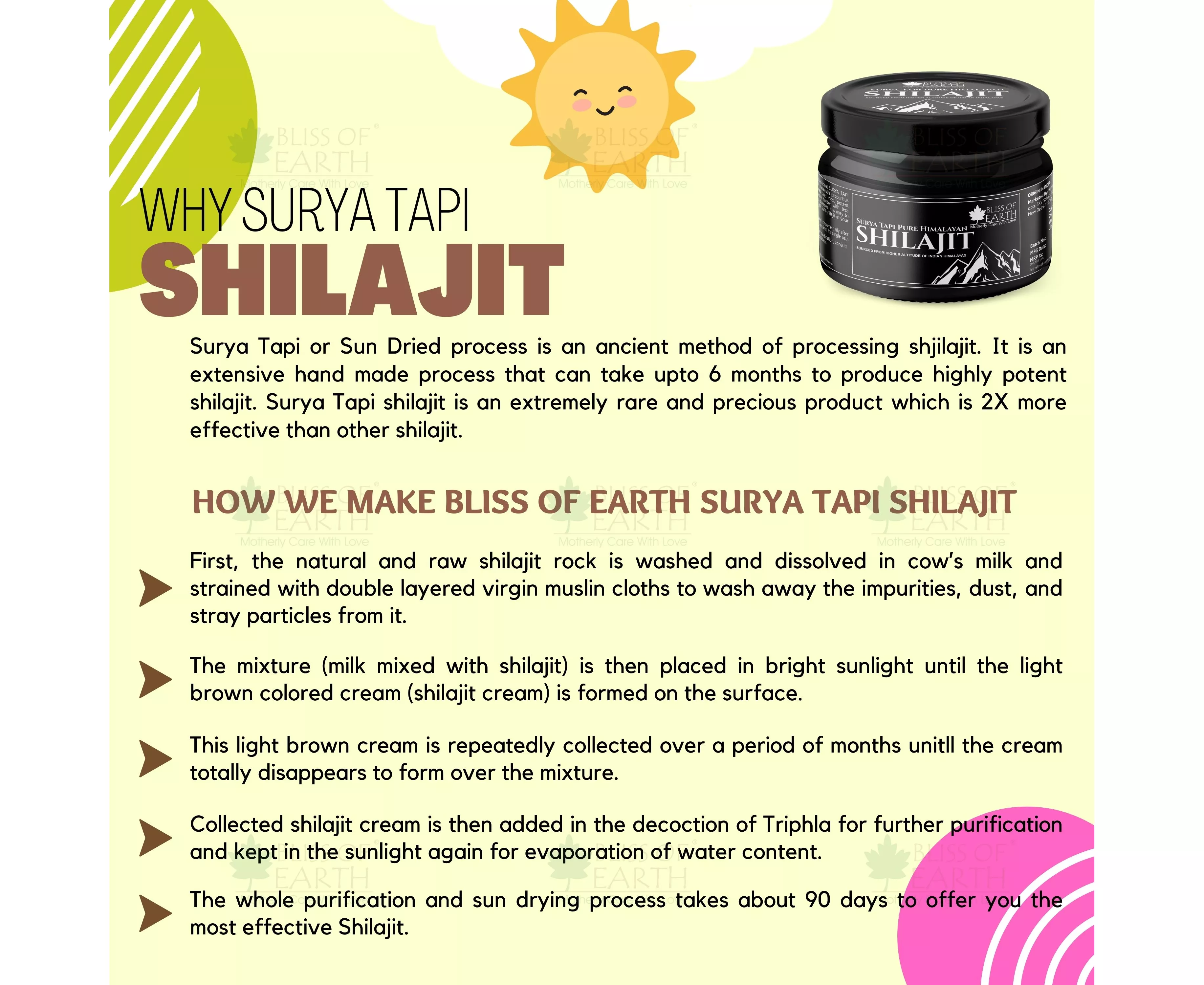 Shilajit is a natural substance found in Himalayas and the best quality shilajit is harvested from the remote mountain at the highest altitudes of Himalayas where the extreme conditions serve to preserve Shilajit’ s nutrients. Shilajit is a naturally occurring product of gradual decomposition of some plants for centuries. The black tar-like substance contains several minerals in ionic form and is also a great source of fulvic and humic acid. Bliss of Earth shilajit is purified through the traditional SURYA TAPI (Sun Dried) method which preserves most of the molecular properties making it highly potent. Our shilajit is the safest and most potent ayurvedic preparation that gives strength to work harder with less exhaustion and potentially able to prevent several diseases. It is easy to improve your lifestyle by adding Bliss of Earth SURYA TAPI shilajit in your daily diet.
