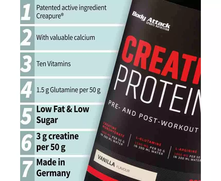 Pre or post workout shake? With Creatine Protein you can beat two ingredients with one can! It contains everything your muscles need before and after an intense workout. Our best creatine as patented Creapure® and a multi-component protein made of whey protein, Wheypep® and milk protein that makes your muscles hearts beat faster with joy. Where can you find this powerful protein powder composition? Only in our Creatine Protein - unique on the market!