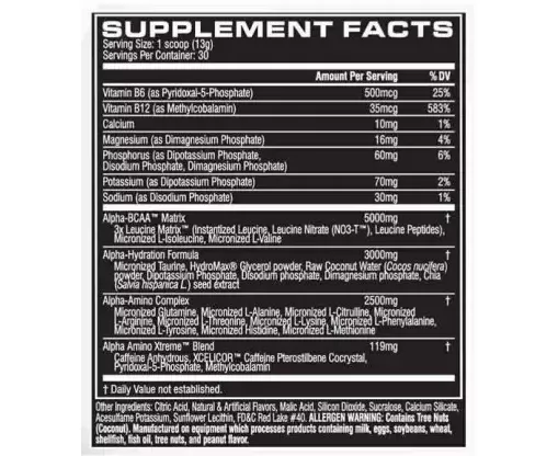 Alpha-amino to include a well-studied 2 1 1 BCAA ratio for optimal performance in addition to 11 essential amino acids. An integral part of the alpha-amino formula is electrolytes, which help keep your body hydrated and ready to tackle any challenge. Electrolytes for hydration to recover from a strenuous workout and help fight muscle breakdown during recovery. Includes well-studied 2 1 1 BCAA ratio for optimal performance in addition to 11 essential amino acids. Alpha-amino is the ultimate performance, hydration, and recovery sports powder. Alpha-amino has 14 amino acids including a well-studied 2 1 1 BCAA ratio, which features our proprietary 3x leucine matrix. BCAAs are known to support muscle maintenance, endurance and recovery, but alpha amino's 3x leucine matrix takes the power of BCAAs one step further. 3X leucine includes instantized l leucine, leucine nitrate and leucine peptides to enhance the body's ability to fuel skeletal muscles, preserve muscle glycogen stores and reduce protein breakdown. Alpha amino's alpha hydration formula features chia seed extract, raw coconut concentrate and now, hydromax a novel ingredient that has the ability to increase the concentration of fluid in the tissues of the body. Alpha amino offers a sugar free alternative to traditional sports drinks and is available in a variety of outstanding flavours such as lemon lime, fruit punch and blue raspberry.