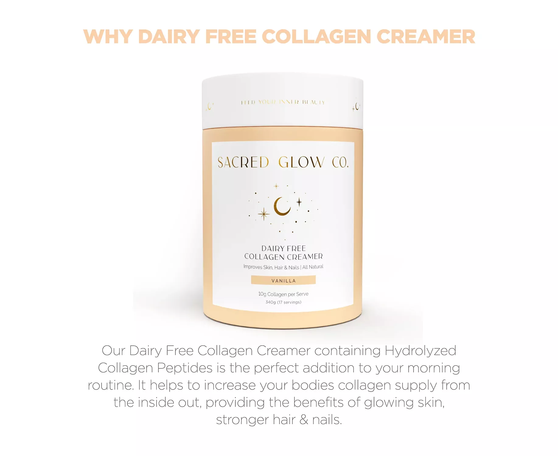Our Dairy Free Collagen Creamer containing Hydrolyzed Collagen Peptides is the perfect addition to your morning routine. It helps to increase your bodies collagen supply providing the benefits of glowing skin, stronger hair & nails. Supplementing with Collagen has been shown to increase collagen production, aid in skin hydration & moisture, improve skin elasticity and reduce the signs of aging.