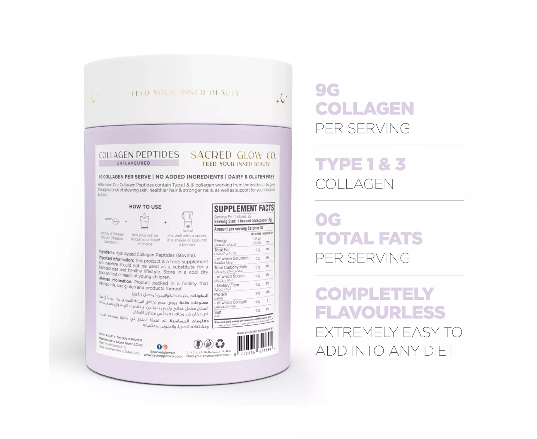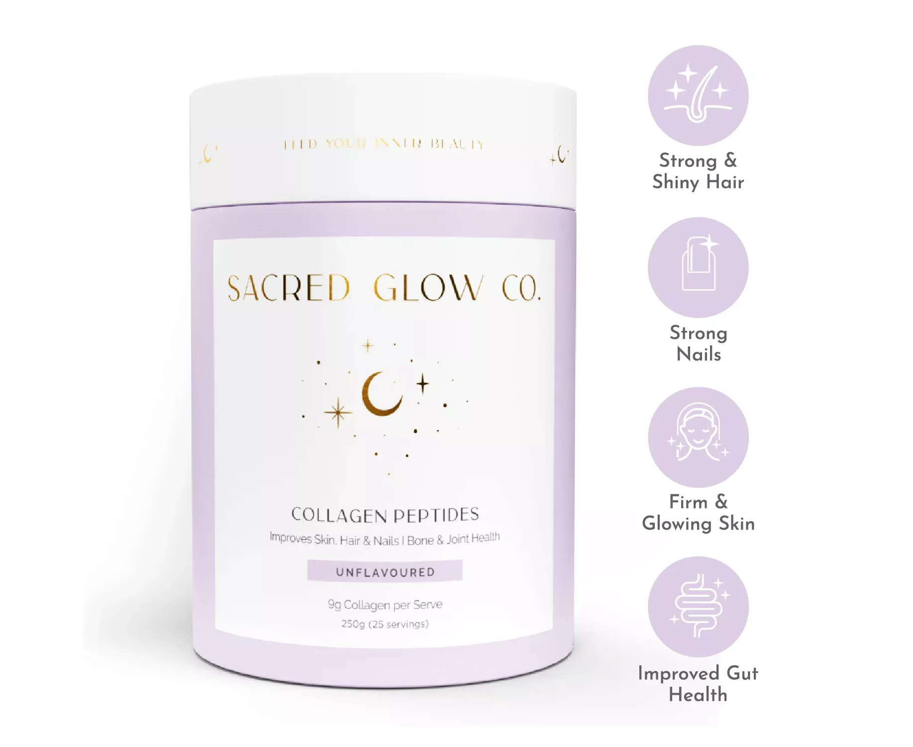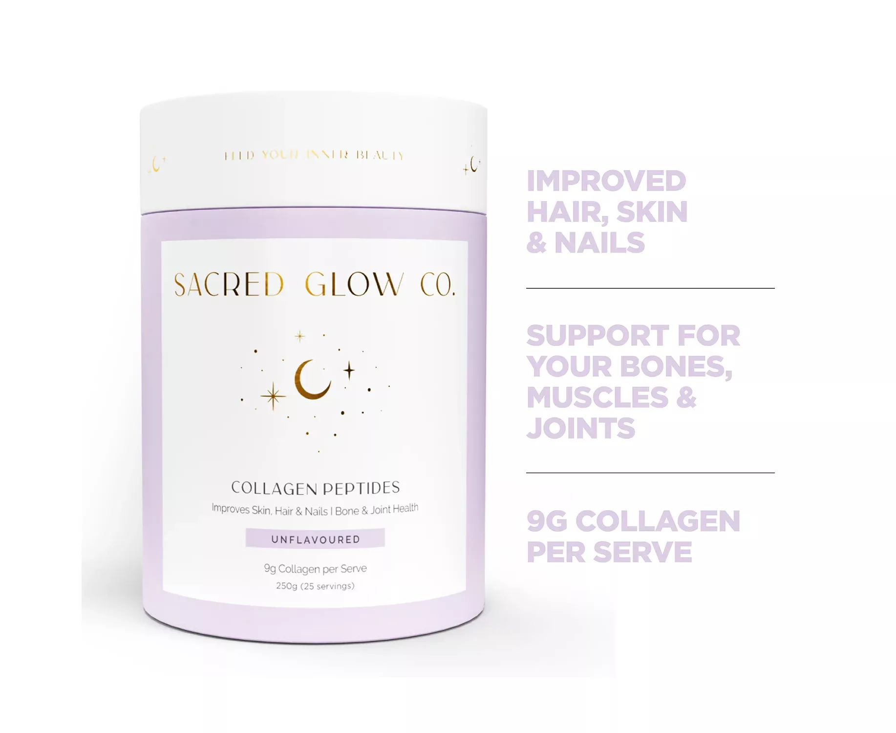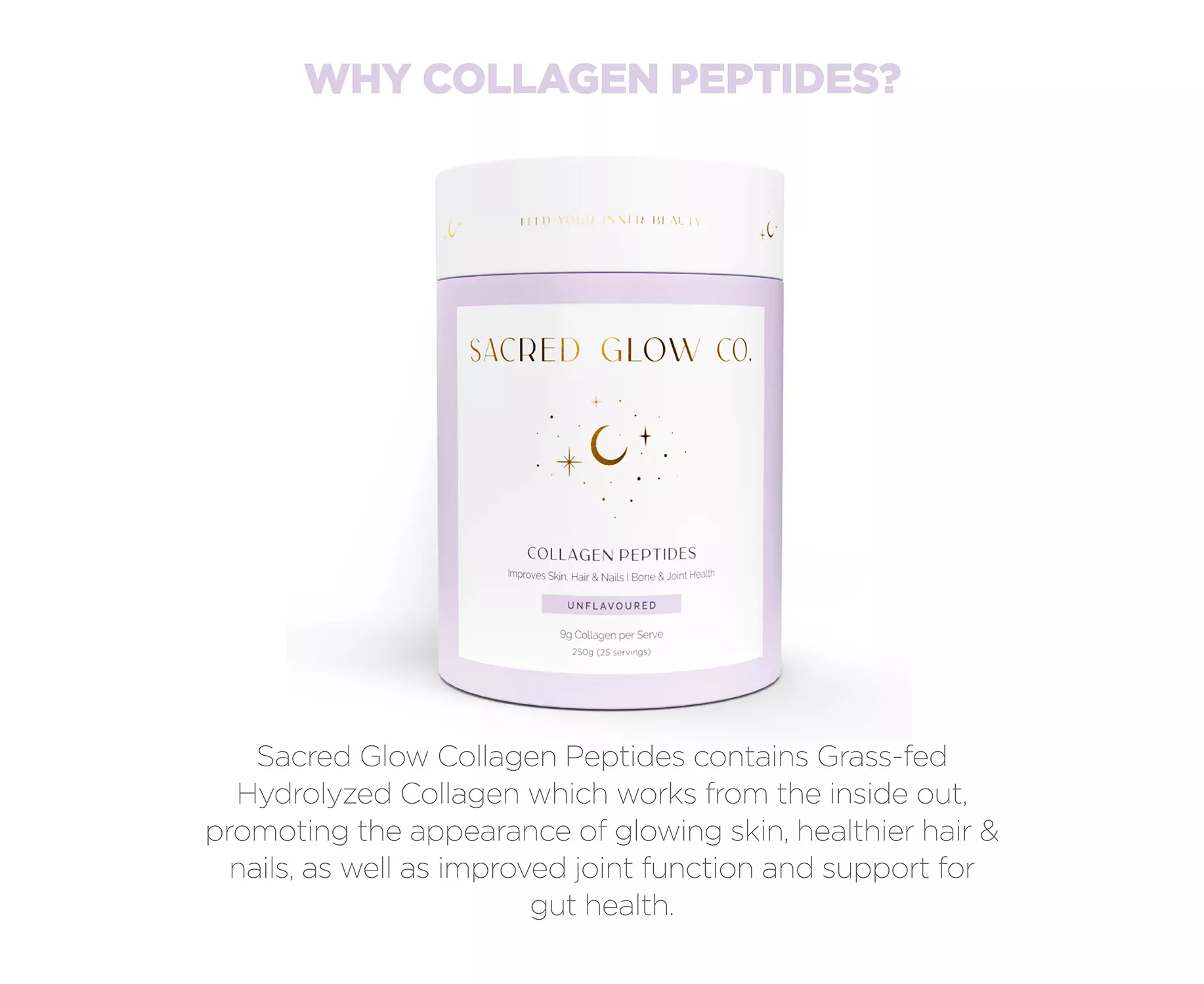 Our Collagen Peptides contain Type I & III hydrolyzed collagen which works from the inside out, giving the appearance of glowing skin, healthier hair & stronger nails, as well as support for your bones & joints. Get that healthy glow from within! Taking a Collagen supplement is a easy way to get that glow from within, providing skin benefits as well as collagen support through out the whole body